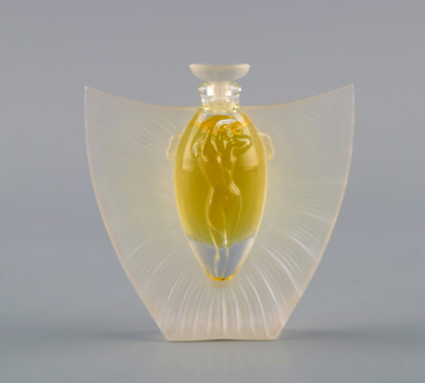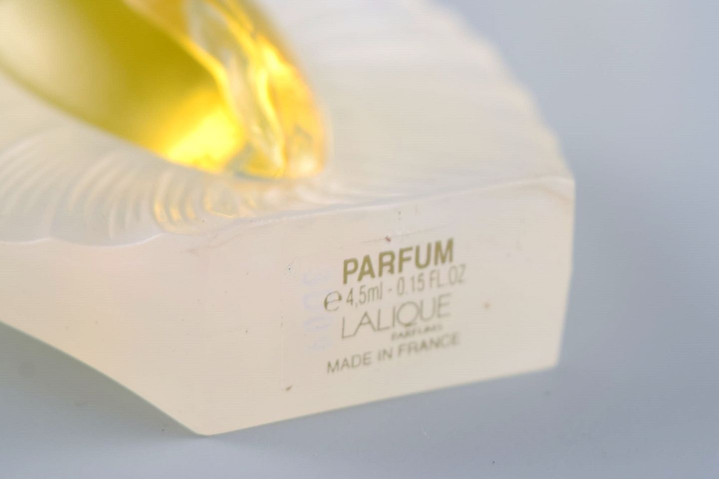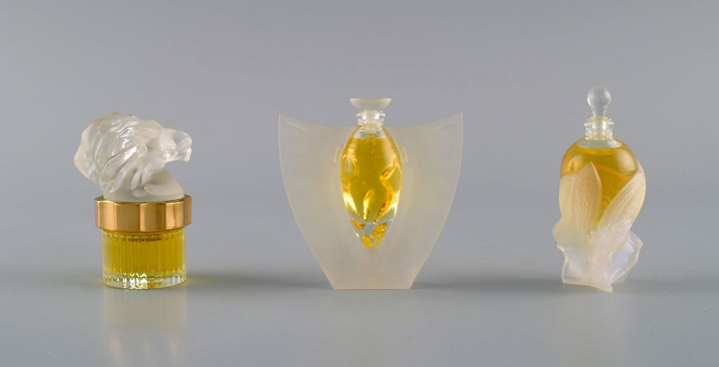 Tre Lalique parfumeflakoner. Sent 1900-tallet. Største måler: 6 x 6 cm. I perfekt stand. Mærkat. Materiale: Glas og forgyldt metal.
