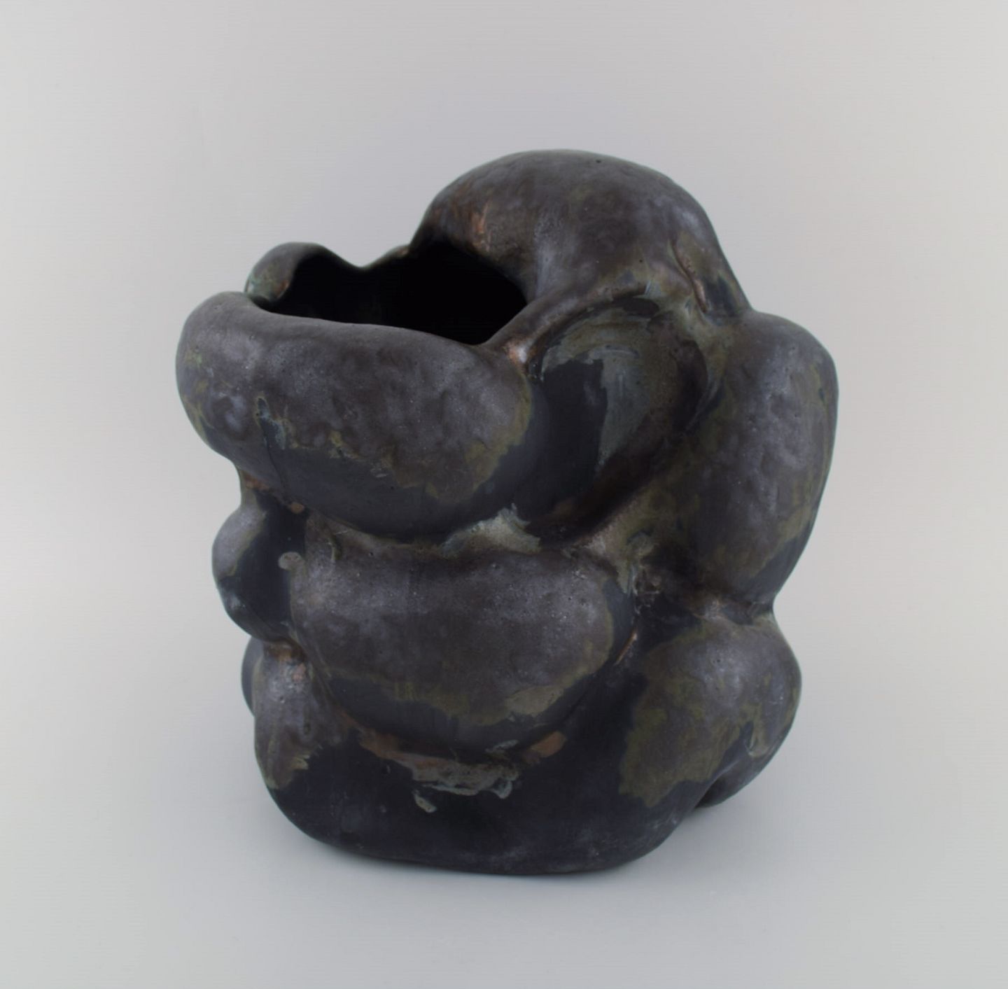 Christina Muff, dansk samtidskeramiker (f. 1971). Stor skulpturel unika vase i glaseret stentøj. Smuk mat sort glasur med metalliske effekter.