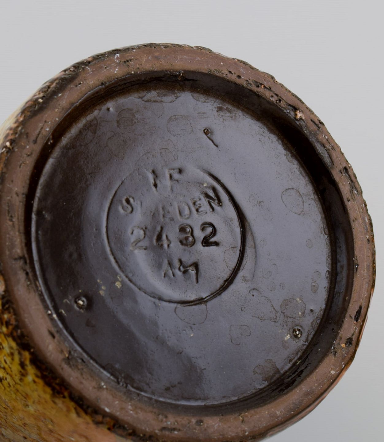 Ingrid Atterberg (1920-2008) for Upsala-Ekeby. Yondel vase i glaseret stentøj. Delt glasur i brune og sennepsgule nuancer. Ca. 1960. Måler: 14,5 x 8 cm. I flot stand. Stemplet.