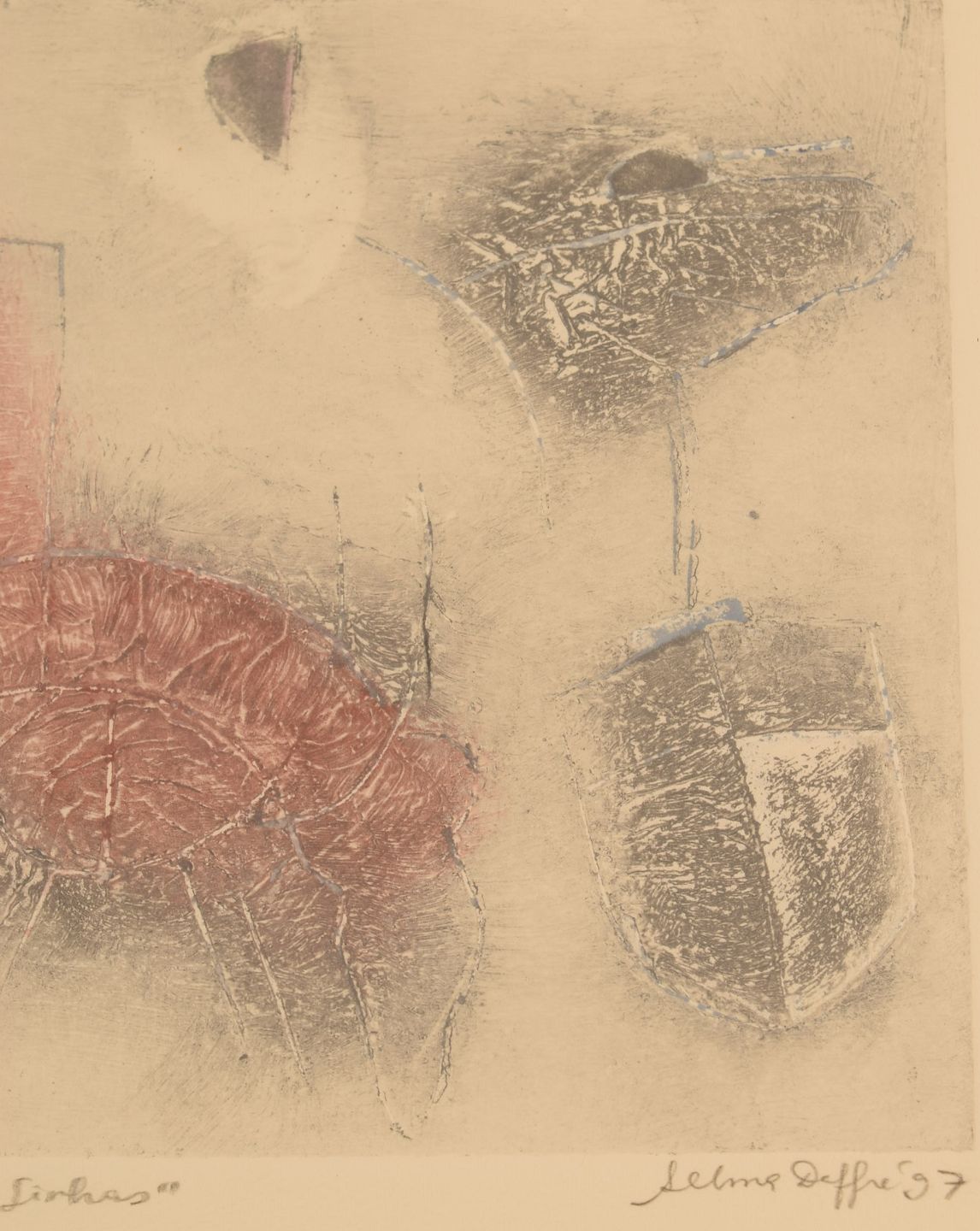Selma Daffre (f. 1951), brasiliansk kunstner. Collografi på papir. "Linhas". Nummereret 4/9. Dateret 1997.