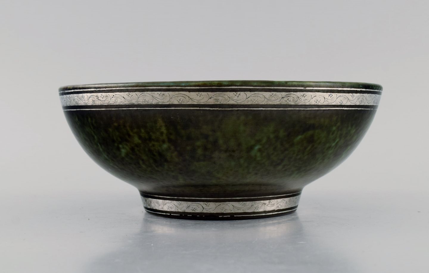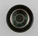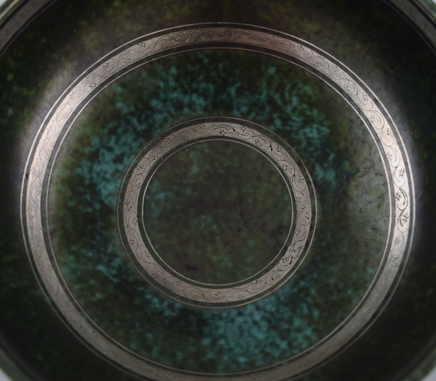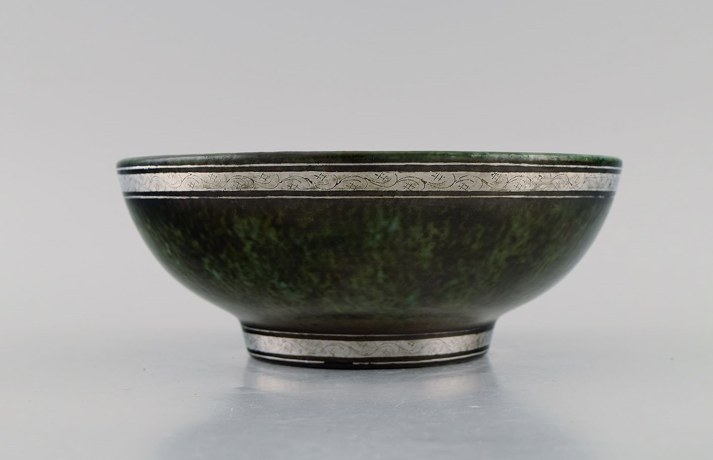 Wilhelm Kåge (1889-1960) for Gustavsberg. Argenta art deco skål i glaseret keramik. Smuk glasur i mørkegrønne nuancer med sølvindlæg. Dateret 1937.