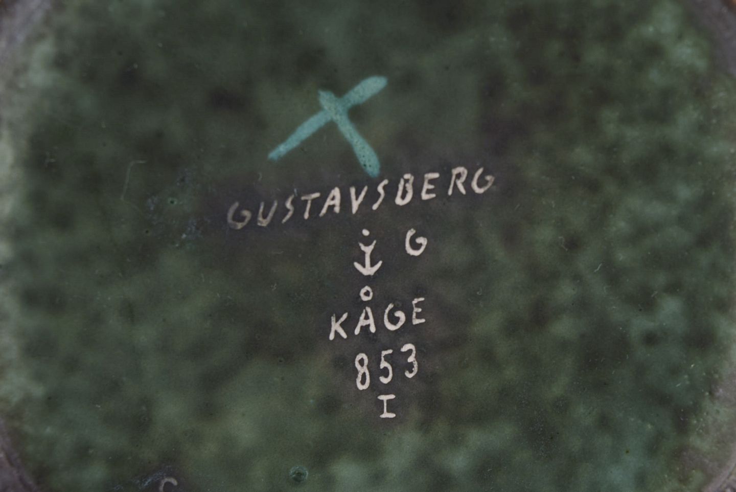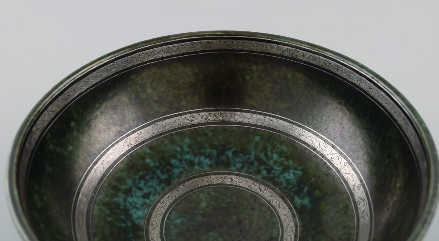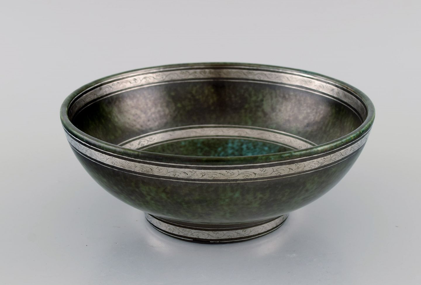 Wilhelm Kåge (1889-1960) for Gustavsberg. Argenta art deco skål i glaseret keramik. Smuk glasur i mørkegrønne nuancer med sølvindlæg. Dateret 1937.