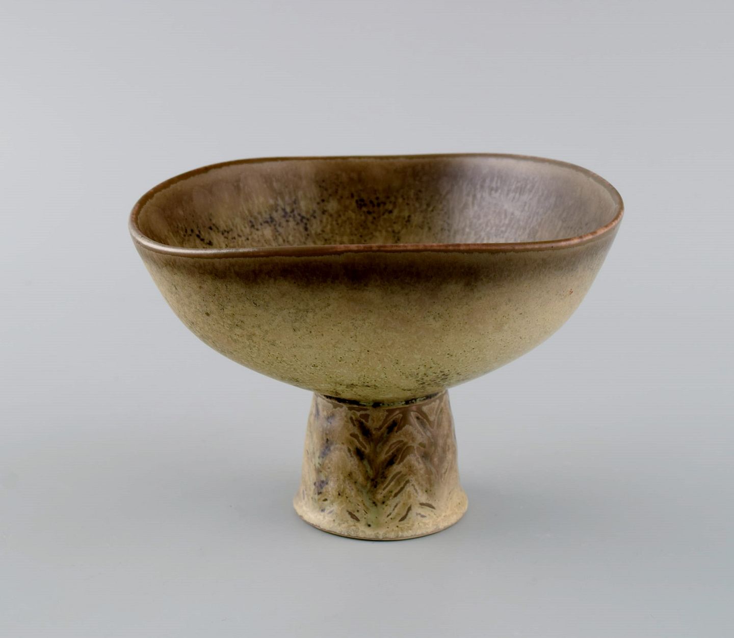 Carl Harry Stålhane (1920-1990) for Rörstrand. Skål på fod i glaseret keramik. Smuk glasur i lyse jordnuancer. Midt 1900-tallet.