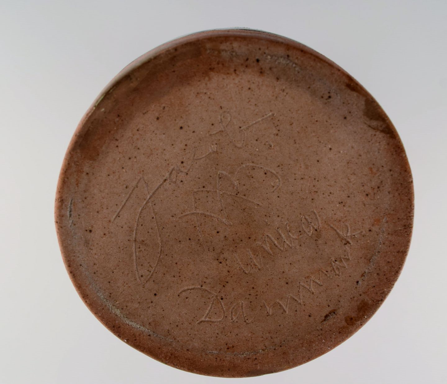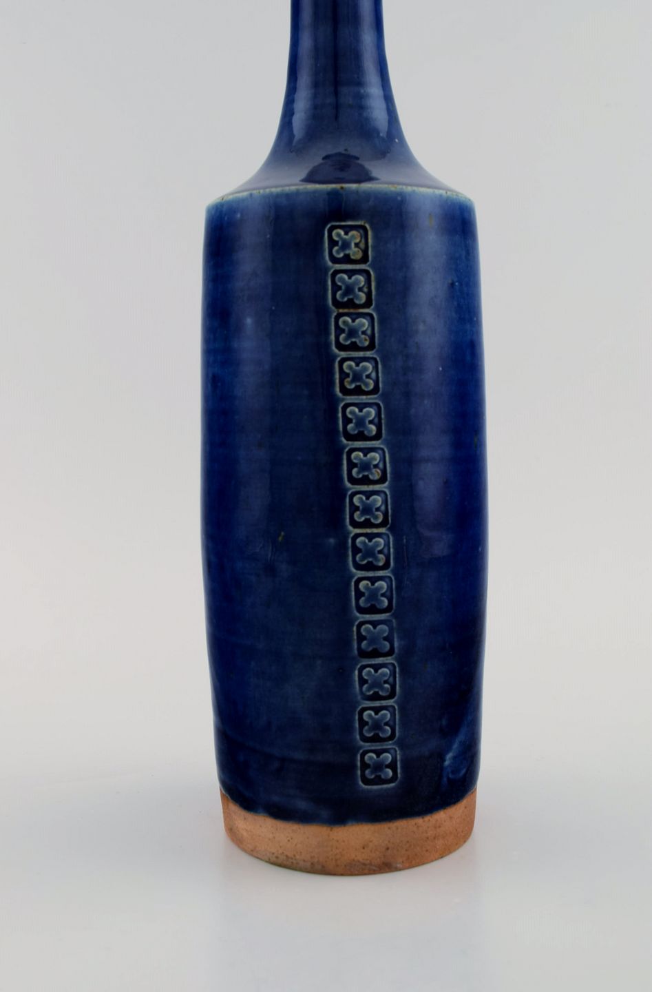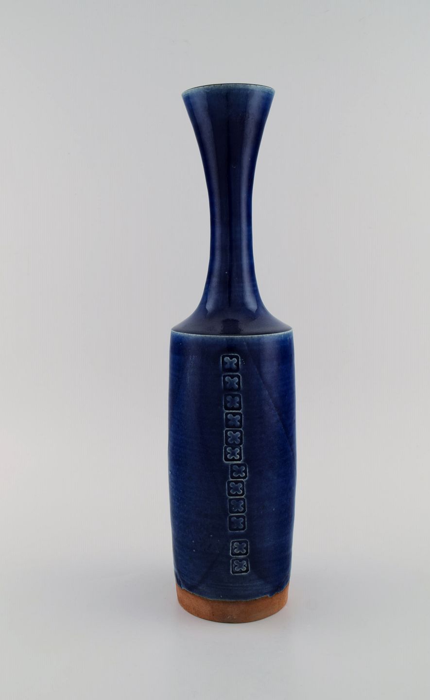 Jacob Bang (1932-2011) for Arne Bang. Stor unika vase i glaseret stentøj med geometriske mønstre. Smuk glasur i blå nuancer. Midt 1900-tallet.