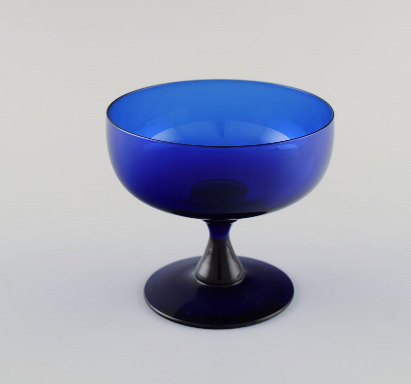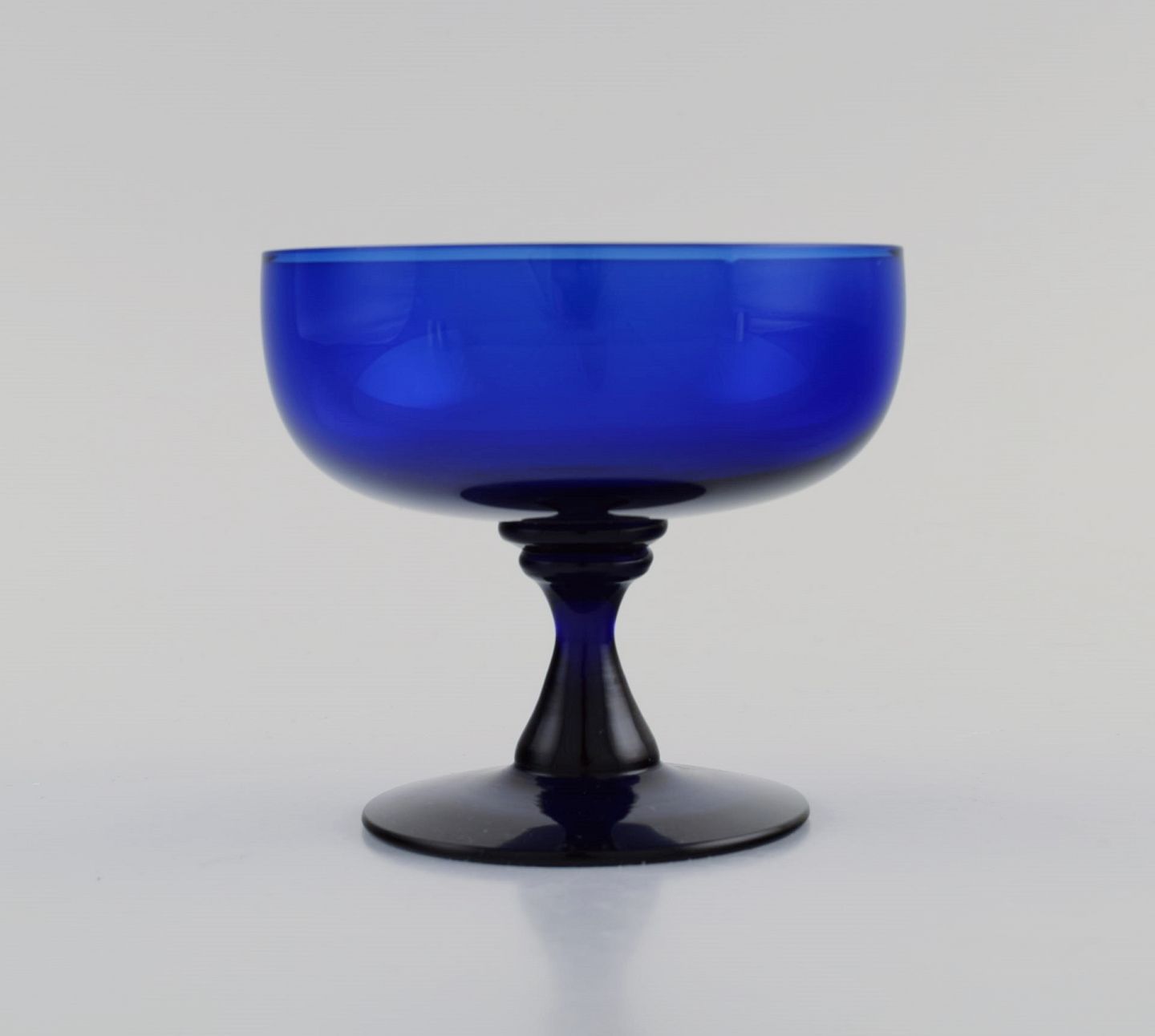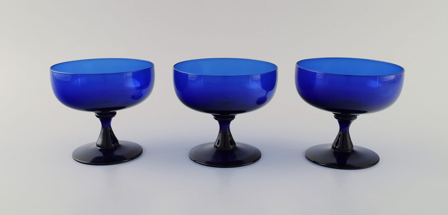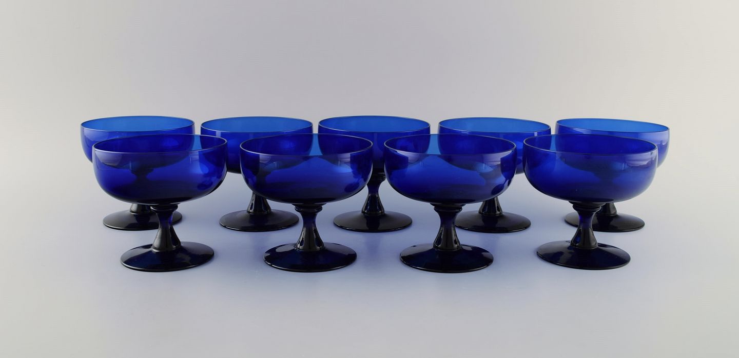 Monica Bratt for Reijmyre. 9 glas i blåt mundblæst kunstglas. Svensk design, midt 1900-tallet. Måler: 10,3 x 9,5 cm. I flot stand.