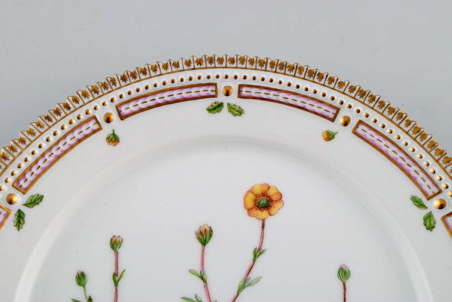 Royal Copenhagen Flora Danica tallerken i håndmalet porcelæn med blomster og gulddekoration. Modelnummer 20/3572. Diameter: 22 cm. I perfekt stand. 1. Sortering. Stemplet.