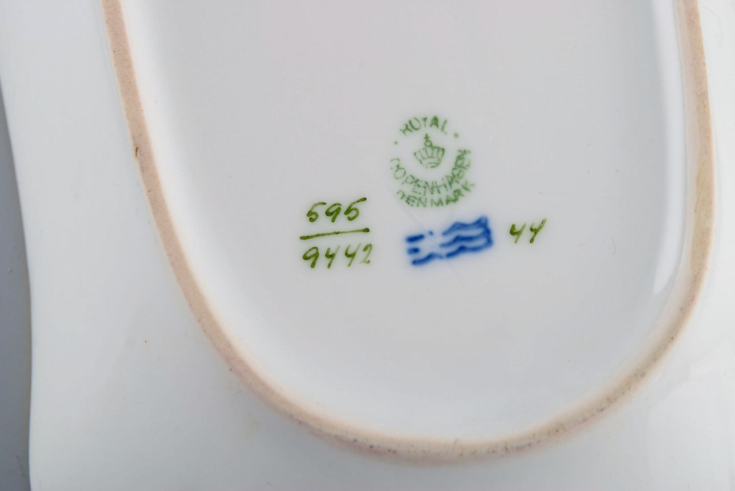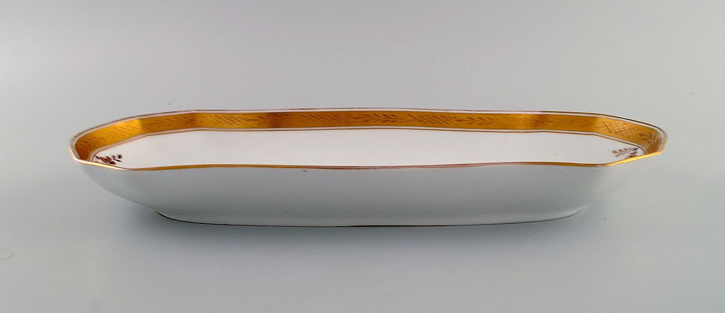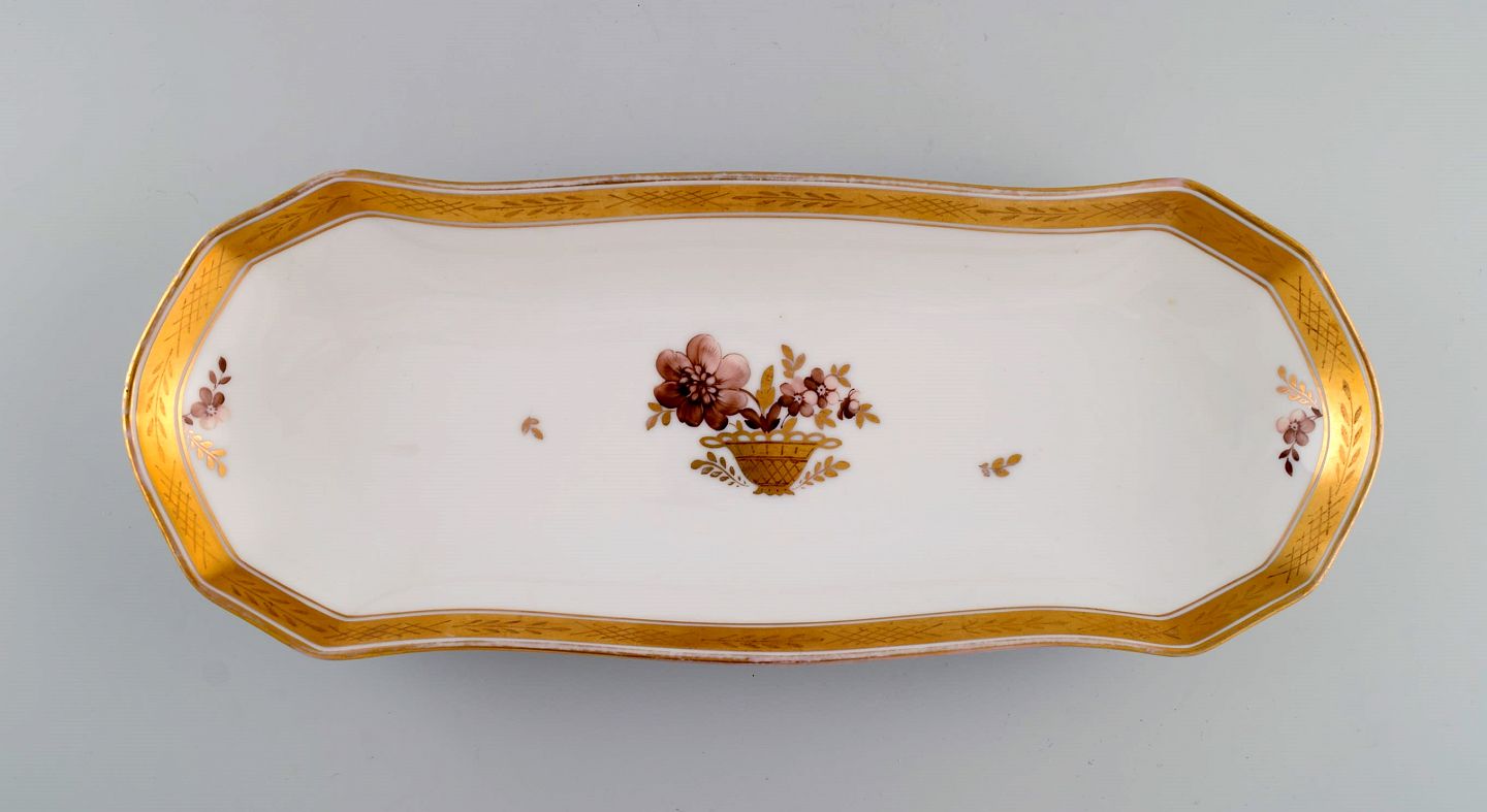 Aflangt Royal Copenhagen Guldkurv serveringsfad i porcelæn med blomster og gulddekoration. Modelnummer 595/9442. Tidligt 1900-tallet.