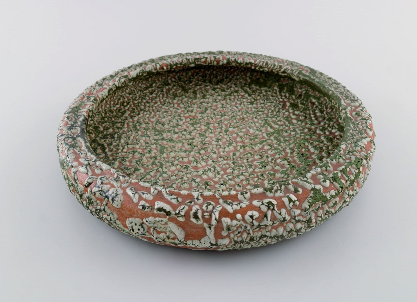 Patrick Nordström (1870-1929). Unika fad / skål i glaseret keramik. Islev, eget værksted. Smuk og usædvanlig spættet glasur. Dateret 1928. Måler: 26,5 x 5 cm. I flot stand. Signeret og dateret.