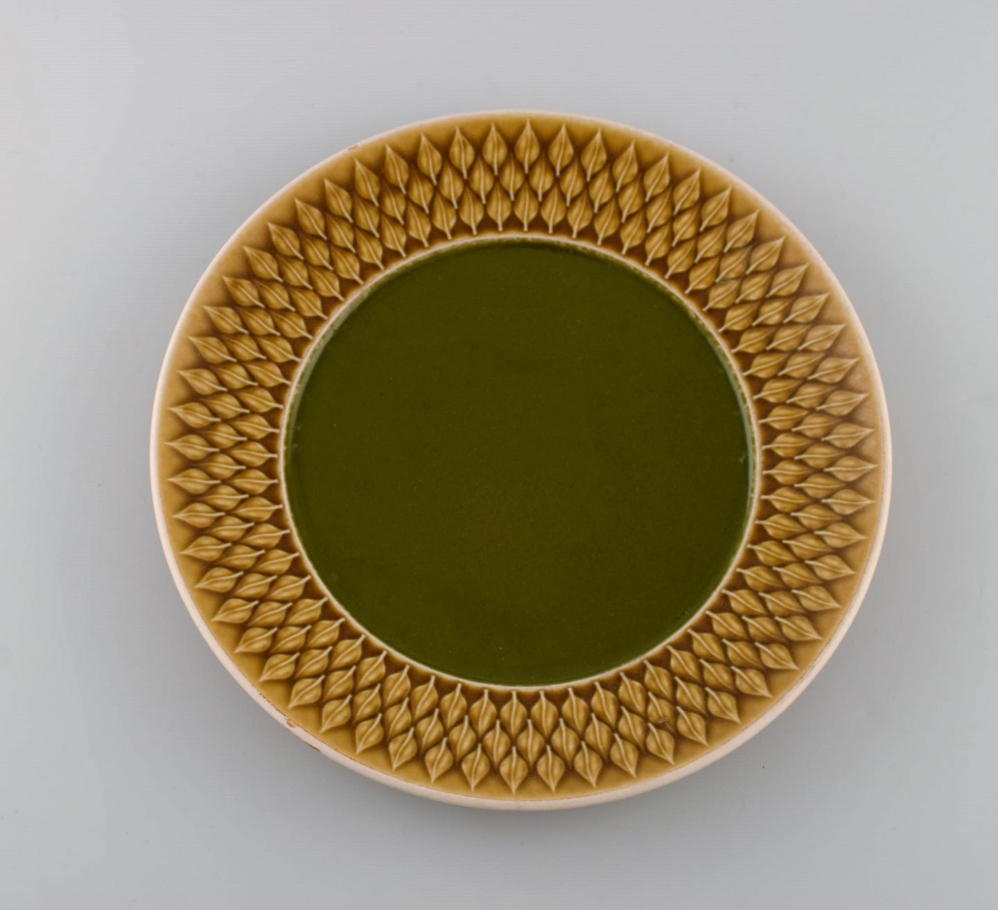 Jens H. Quistgaard (1919-2008) for Bing & Grøndahl. 14 Relief middagstallerkener i glaseret stentøj. Smuk glasur i sennepsgule og grønne nuancer. 1960'erne. Diameter: 25 cm. Stemplet. I flot stand.