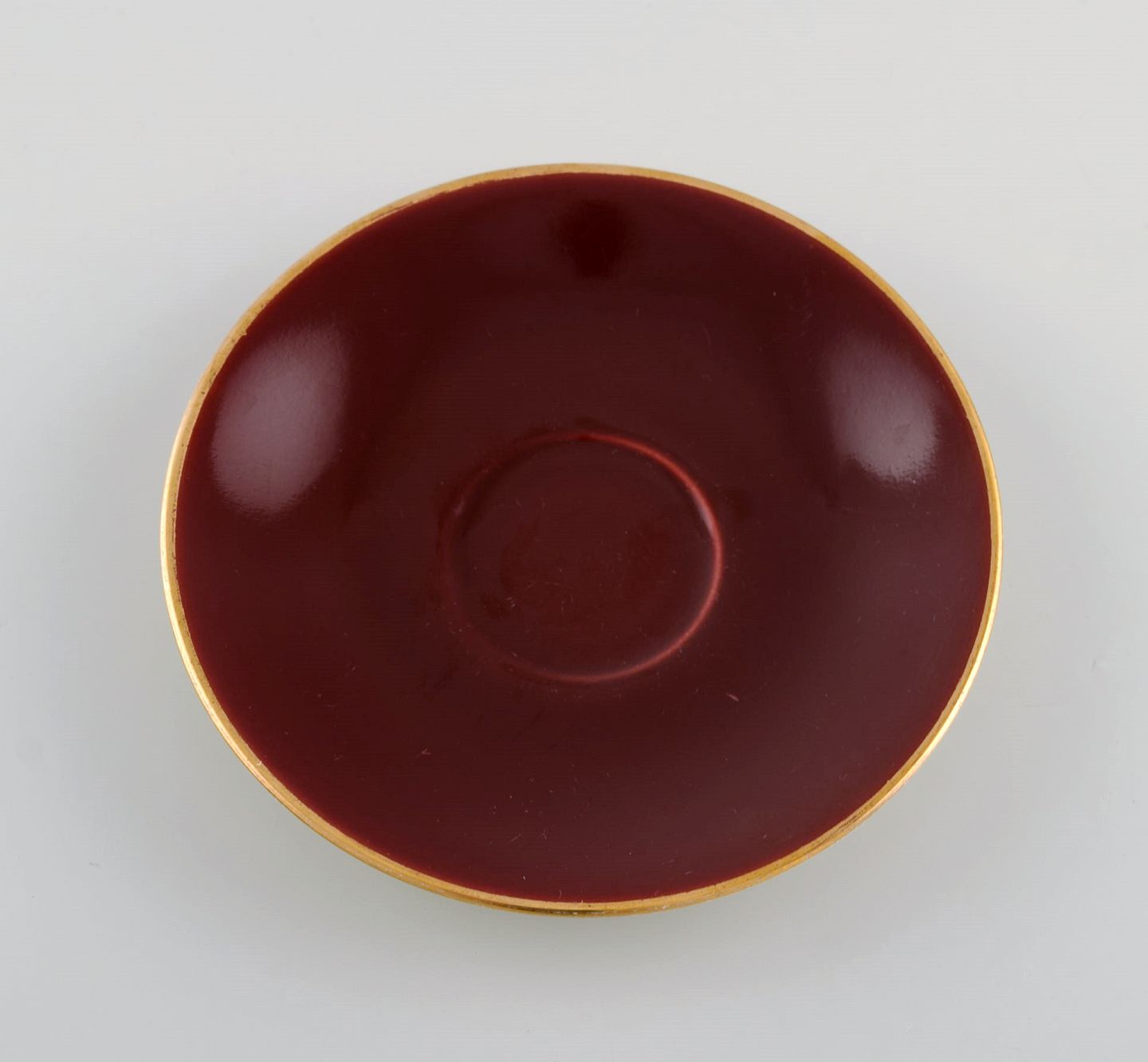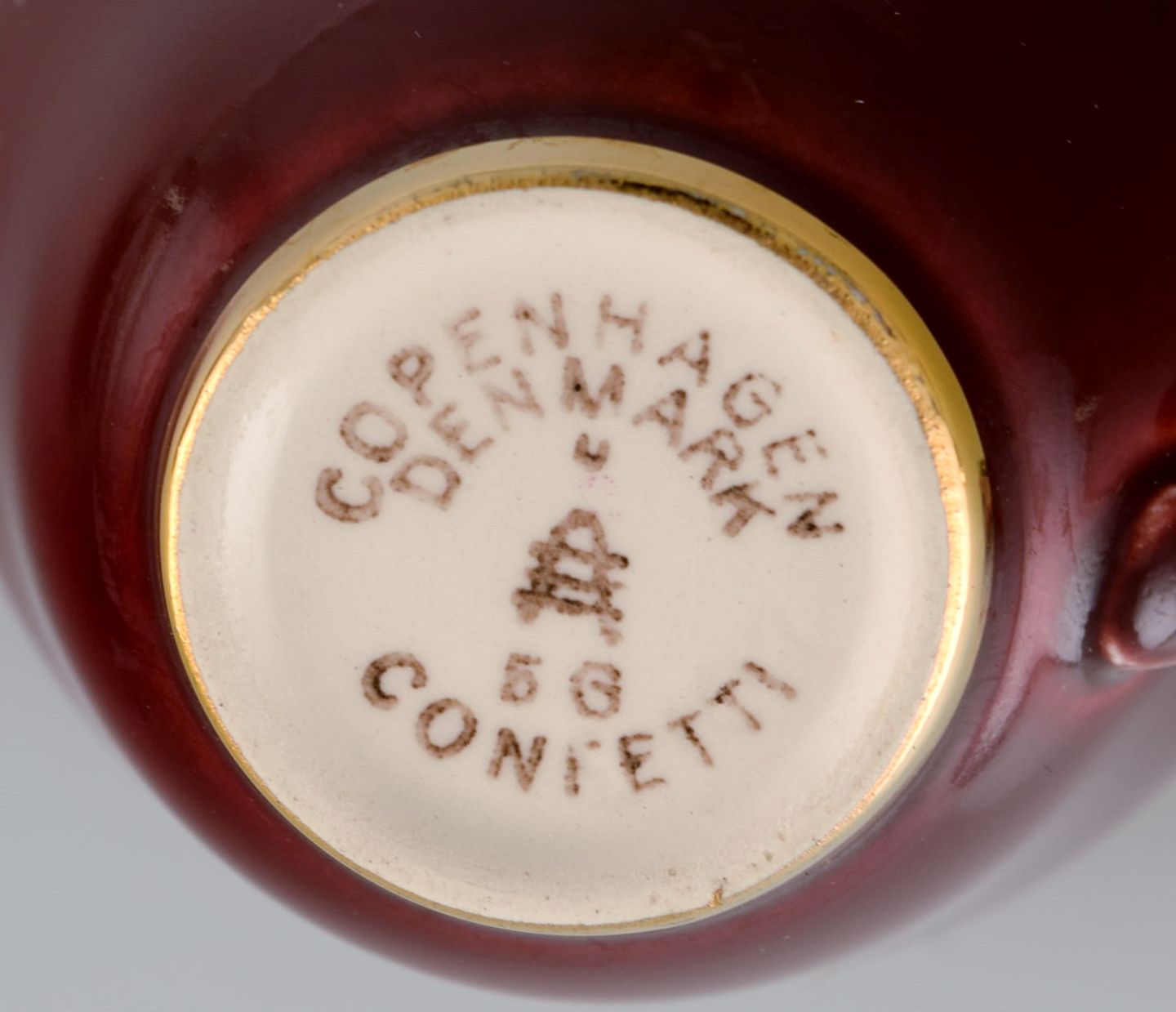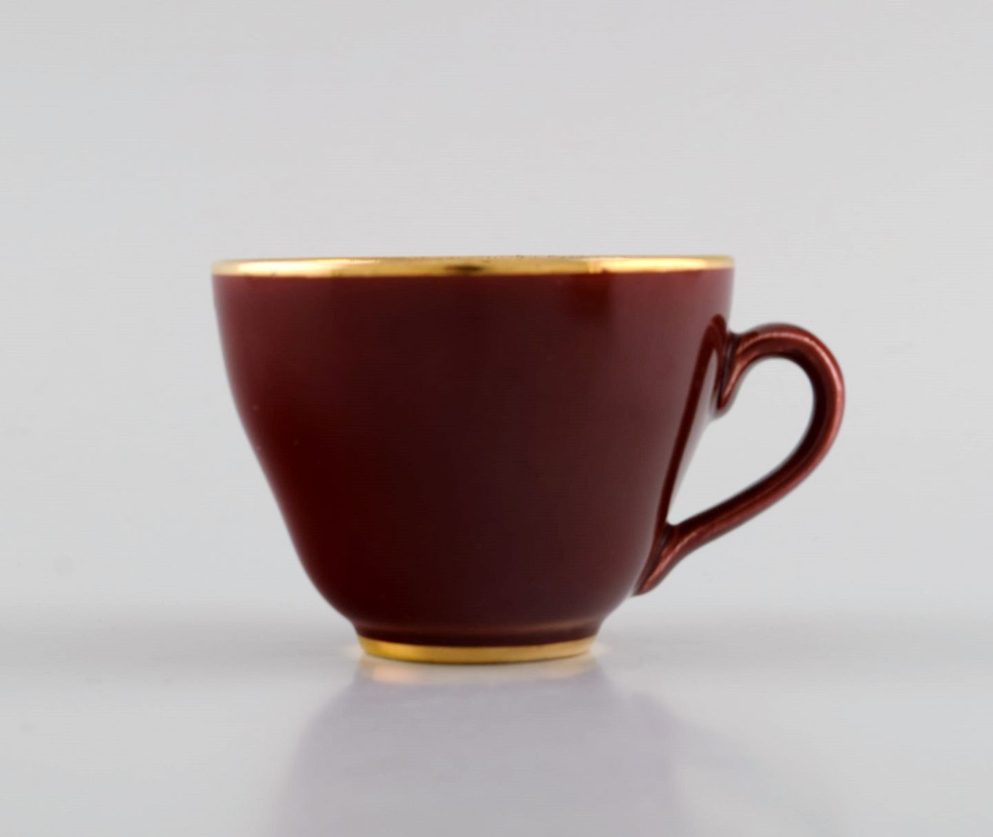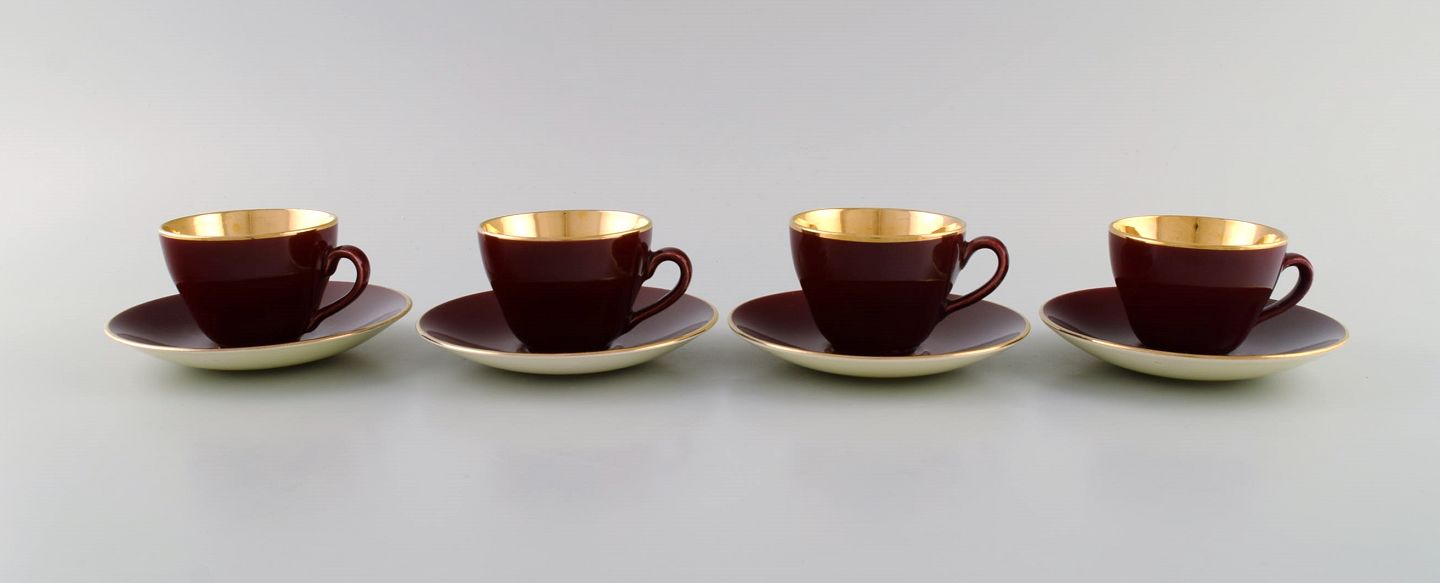 Fire Royal Copenhagen / Aluminia Confetti mokkakopper med underkopper i glaseret fajance med indvendig guld. Midt 1900-tallet.