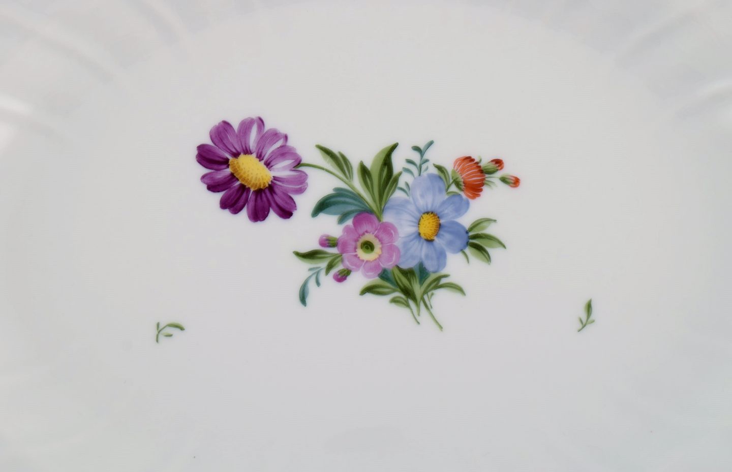 Royal Copenhagen Saksisk Blomst. To ovale serveringsfade i håndmalet porcelæn med blomster og gulddekoration. Modelnummer 493/1555. Tidligt 1900-tallet.