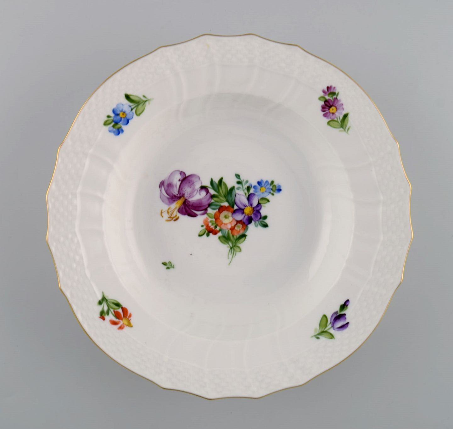 Royal Copenhagen Saksisk Blomst. Syv dybe tallerkener i håndmalet porcelæn med blomster og gulddekoration. Modelnummer 493/1615. Tidligt 1900-tallet. Måler: 23,5 x 5 cm. I flot stand. Stemplet. 2. sortering.