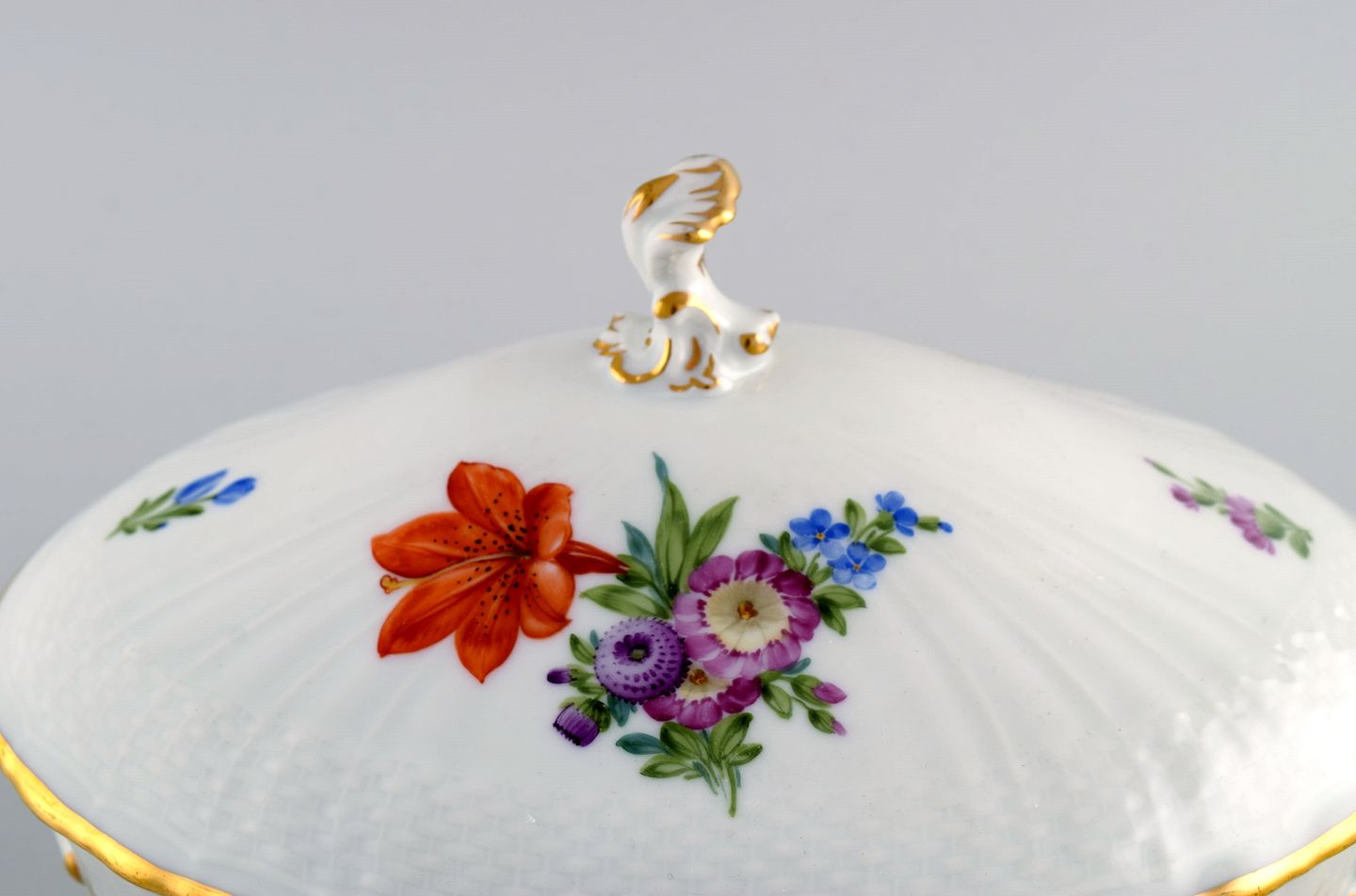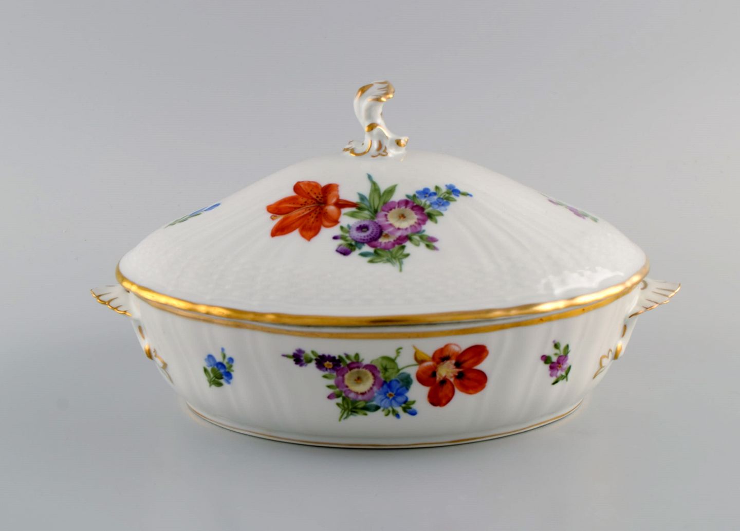 Royal Copenhagen Saksisk Blomst lågterrin i håndmalet porcelæn. Blomster og gulddekoration. Modelnummer 493/1702. Tidligt 1900-tallet. Måler: 27 x 18,5 x 14 cm. I flot stand. Stemplet. 2. sortering.