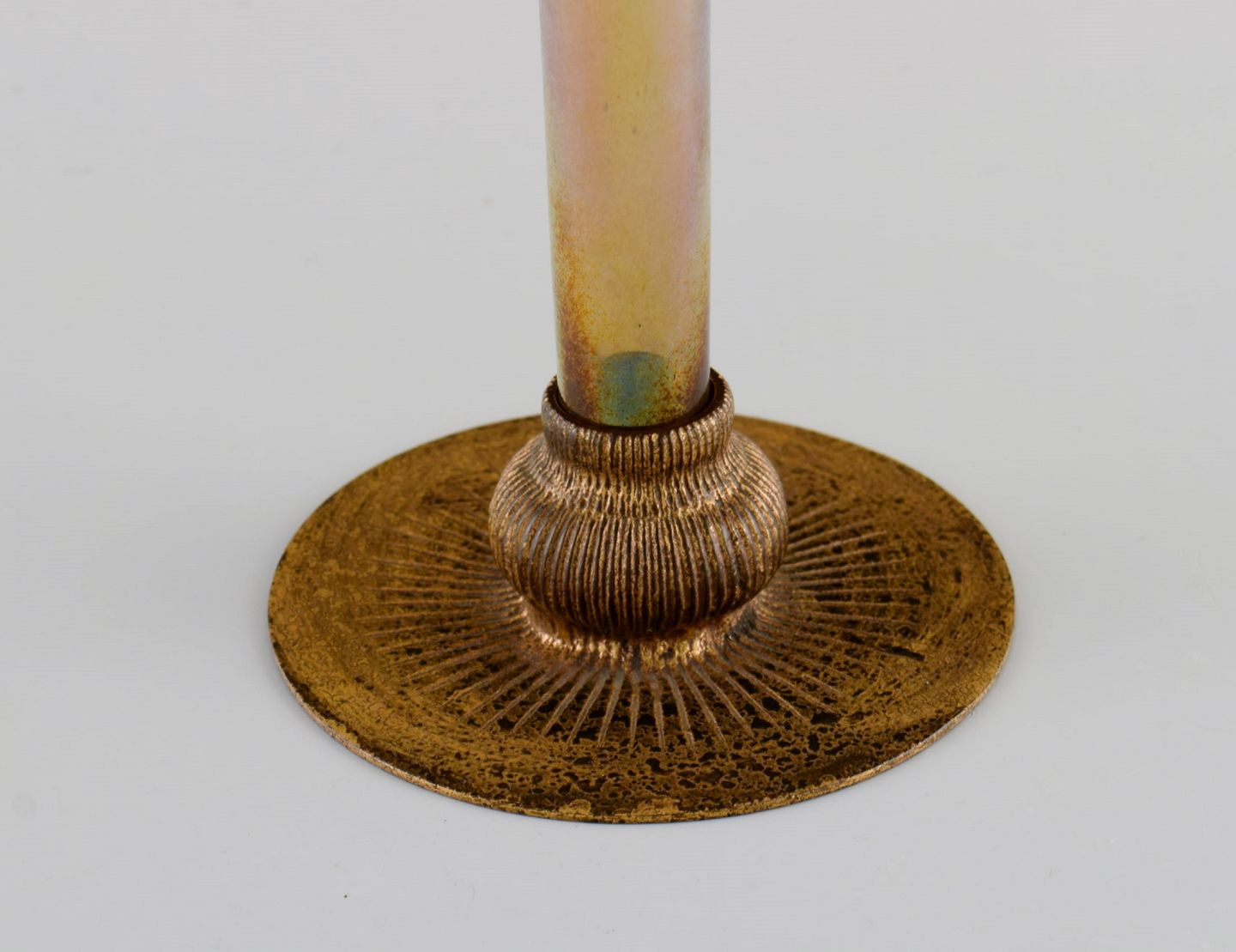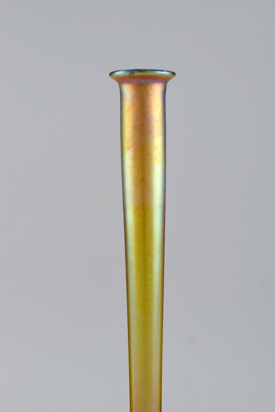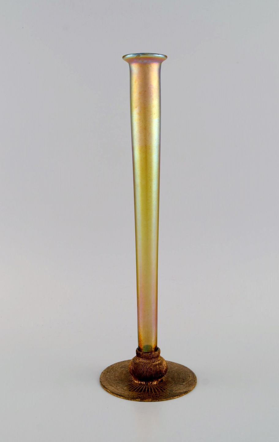 Antik Tiffany Favrile vase i iriserende mundblæst kunstglas med bronzefod. Tidligt 1900-tallet. Måler: 31 x 9,5 cm. I flot stand. Signeret.