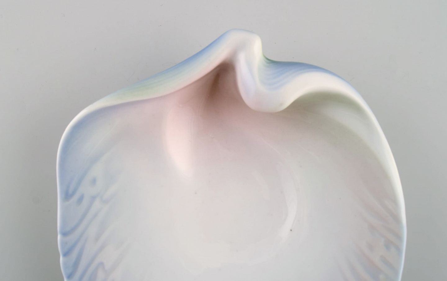 Bing & Grøndahl art nouveau asiet formet som muslingeskal. Tekst modelleret i relief "Bing & Grøndal's porcelæn". Dateret 1914-1915. Måler: 16,5 x 16 cm. I flot stand. Stemplet.