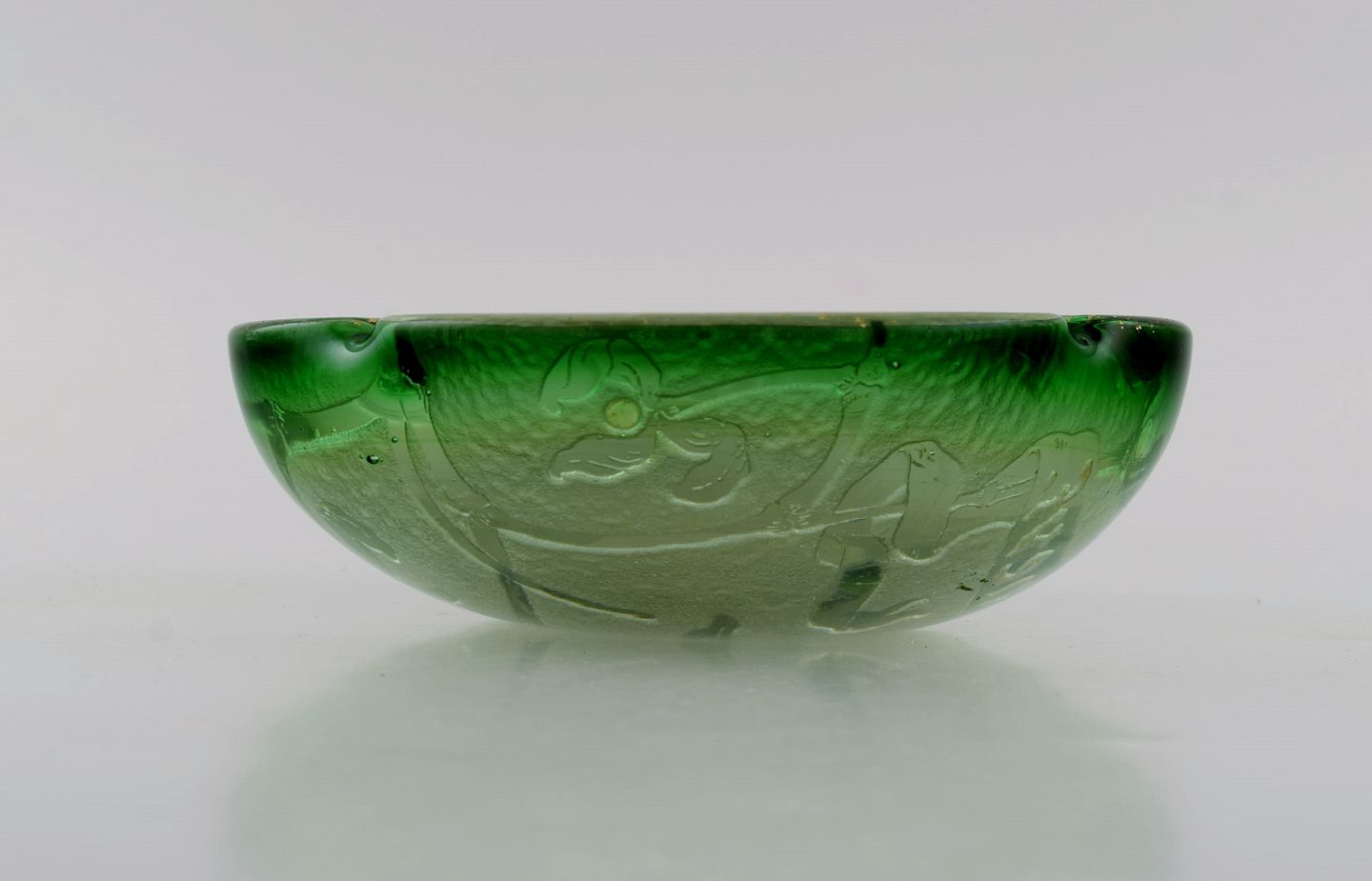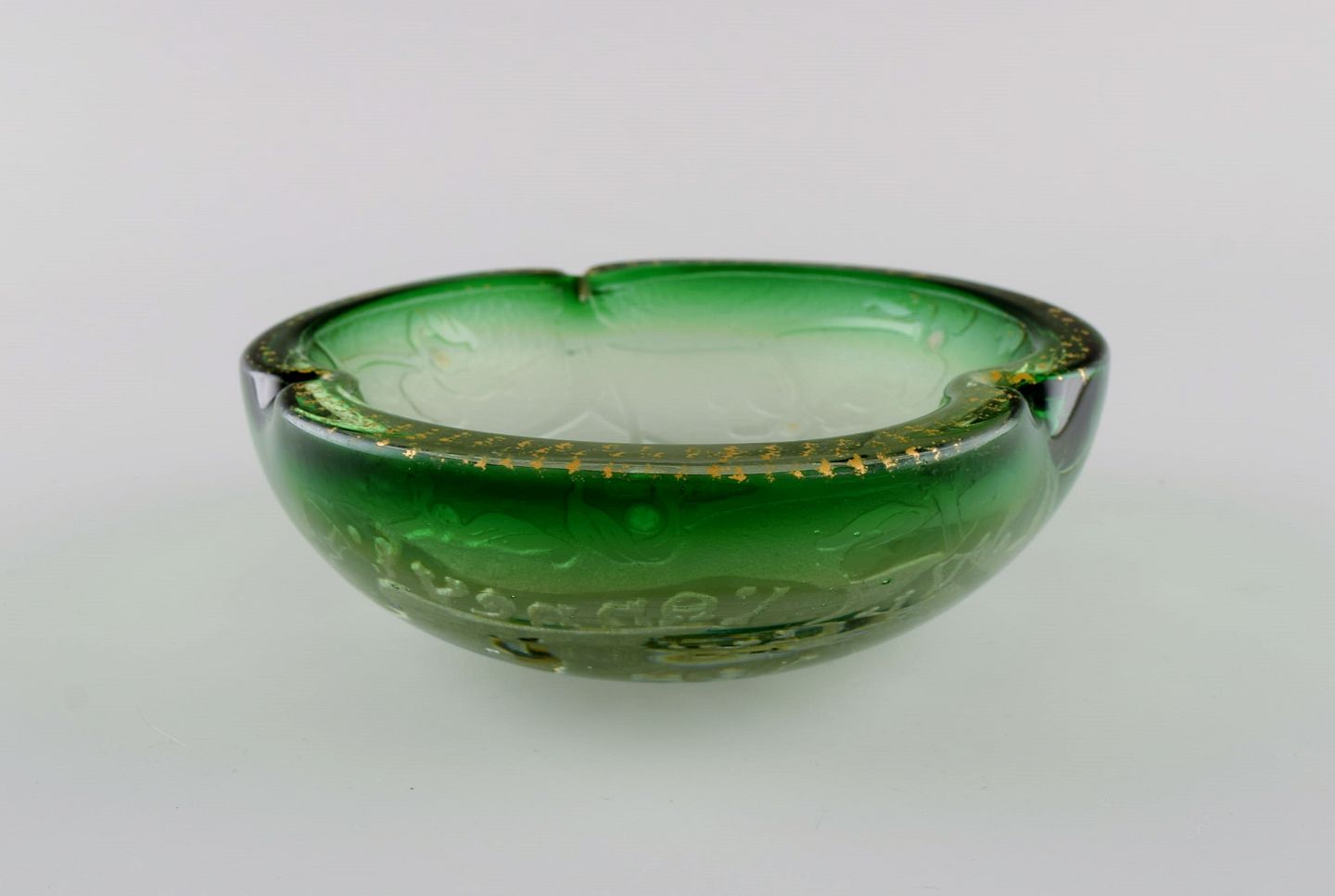 Daum Nancy, Frankrig. Art nouveau skål i grønt mundblæst kunstglas. Blomster i relief og håndmalet gulddekoration. Ca. 1900.