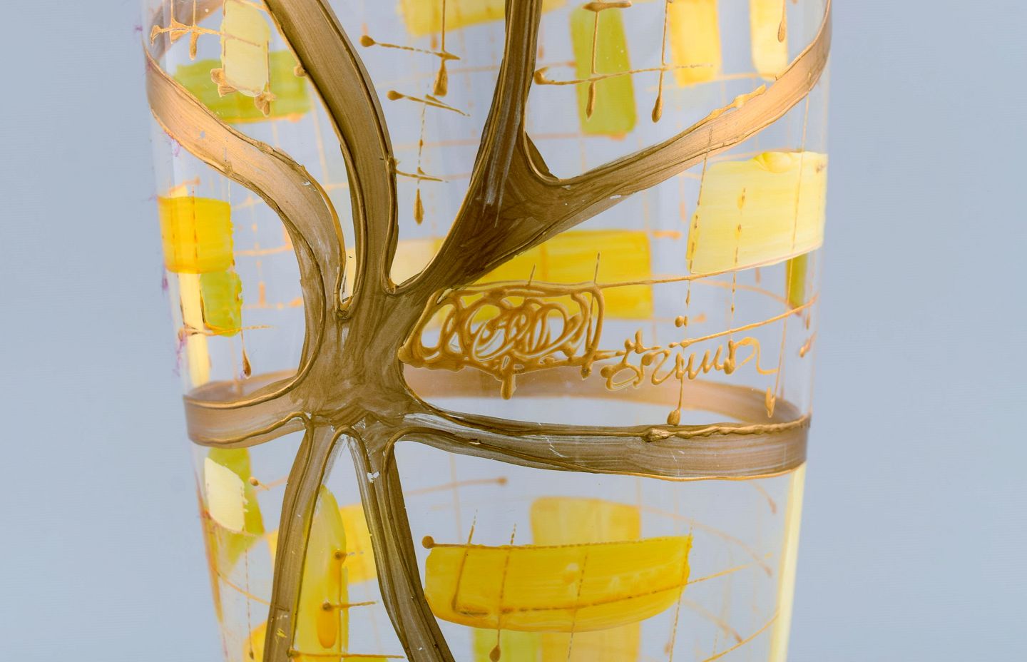 Stor gulvvase i mundblæst kunstglas. Håndmalet geometrisk mønster i guld og gul. 1960'erne.
