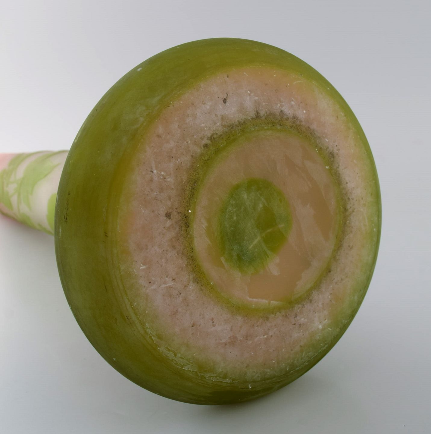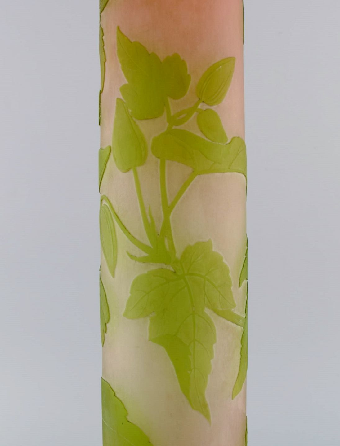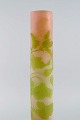 Stor Emile Gallé vase i matteret kunstglas med grønt overfang udskåret med motiver i form af bladværk. Tidligt 1900-tallet. Måler: 59 x 19,5 cm. I flot stand. Signeret.