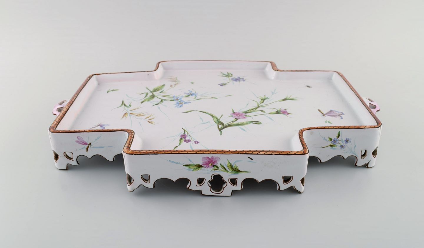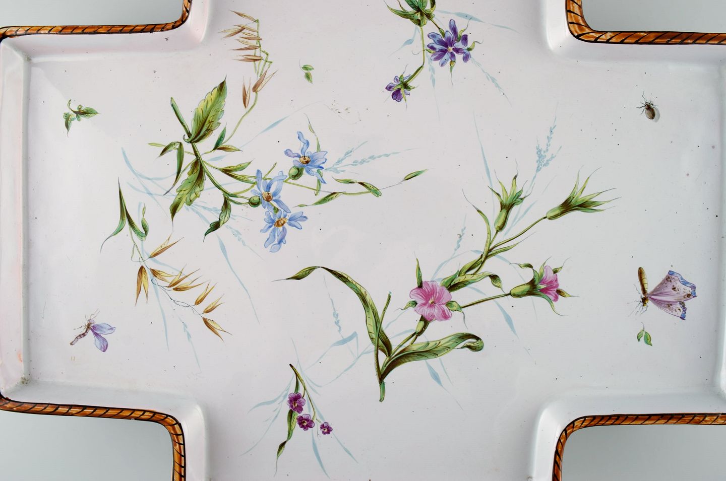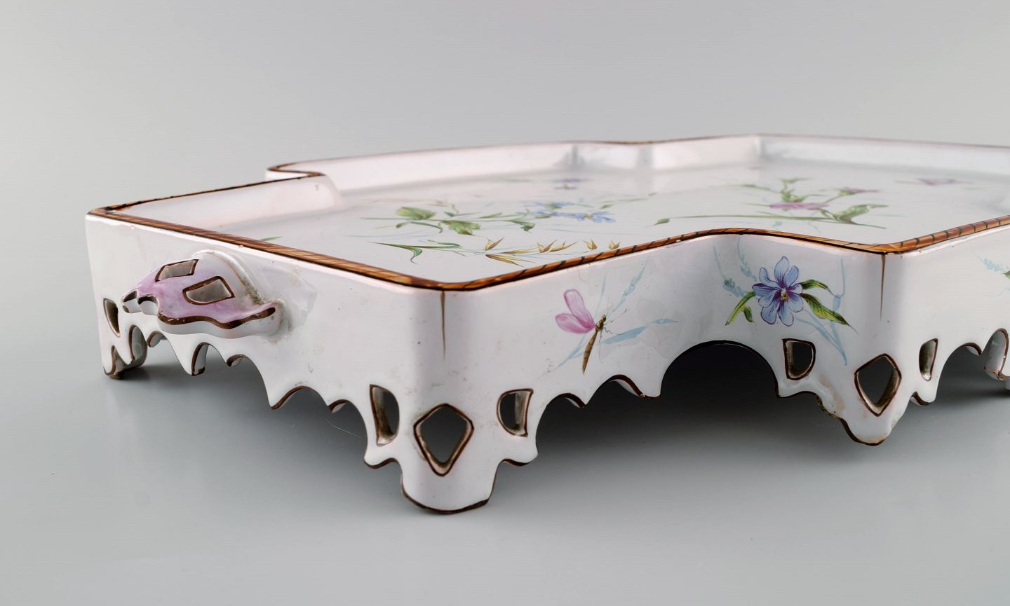 Emile Gallé for St. Clement, Nancy. Stor og sjælden serveringsbakke med hanke. Håndmalet fajance med blomster og sommerfugle. 1870/80'erne.