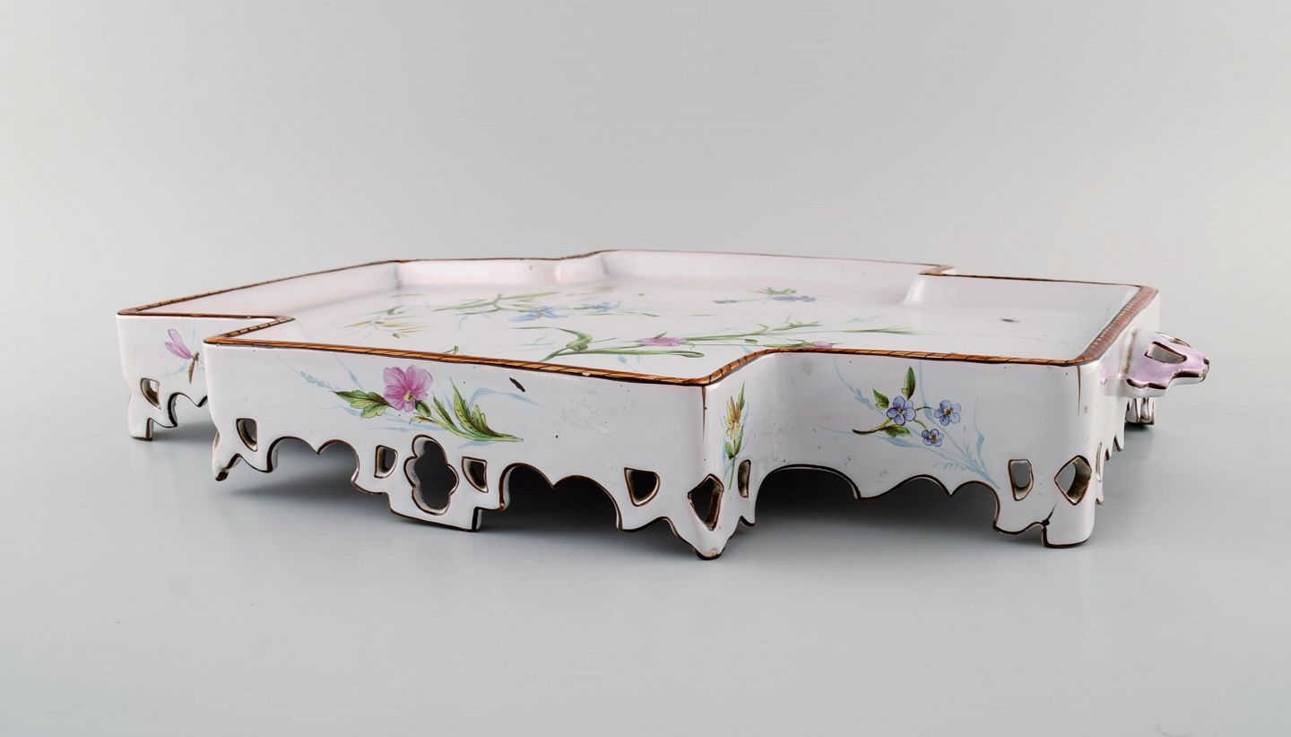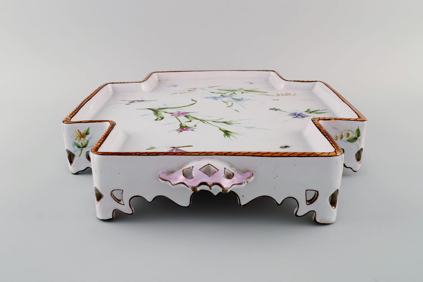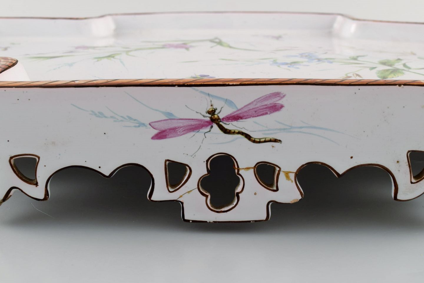 Emile Gallé for St. Clement, Nancy. Stor og sjælden serveringsbakke med hanke. Håndmalet fajance med blomster og sommerfugle. 1870/80'erne.