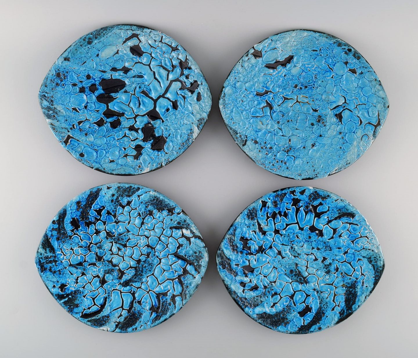 Fransk keramiker. Otte middagstallerkener i glaseret stentøj. Smuk glasur i azurblå nuancer. Unika keramik af høj kvalitet. Midt 1900-tallet. Måler: 26 x 23 cm. I flot stand.
