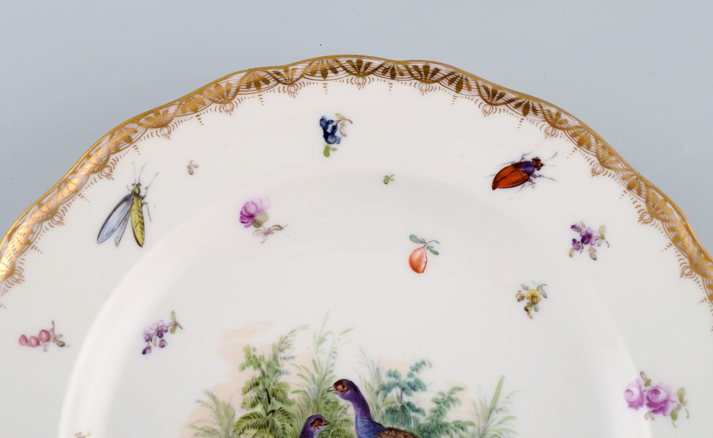 Antique and rare Meissen porcelain plate with hand-painted birds, insects and gold decoration. 19th century. Diameter: 24.5 cm. In excellent condition. Stamped. 3rd factory quality.