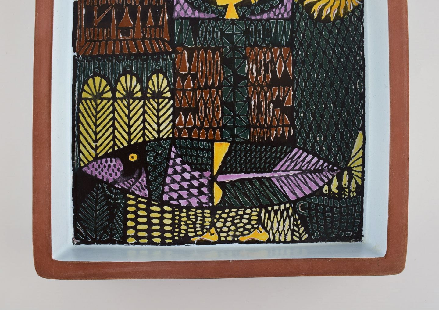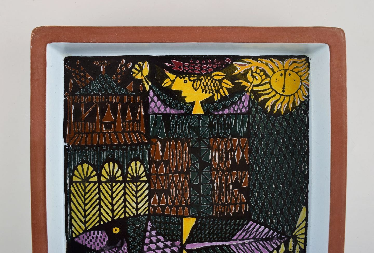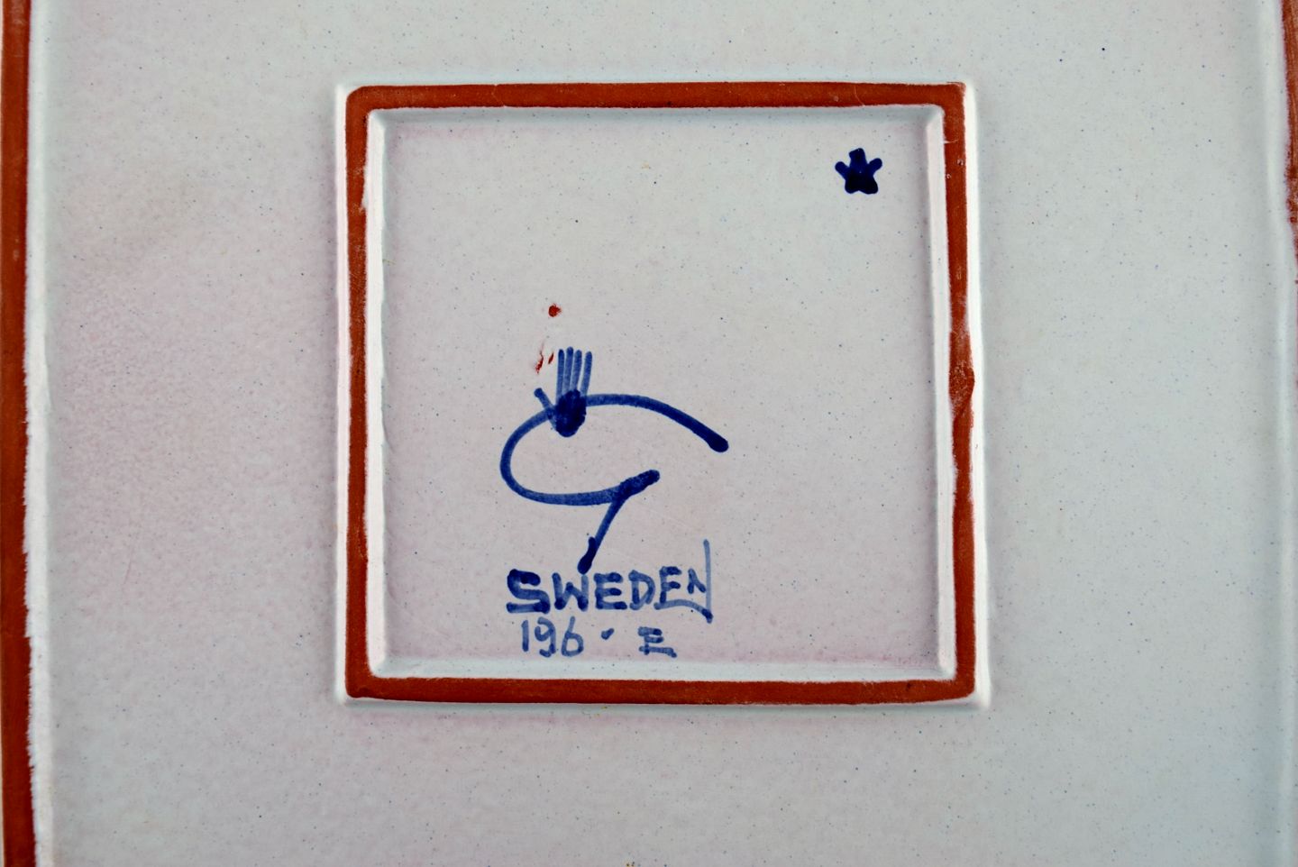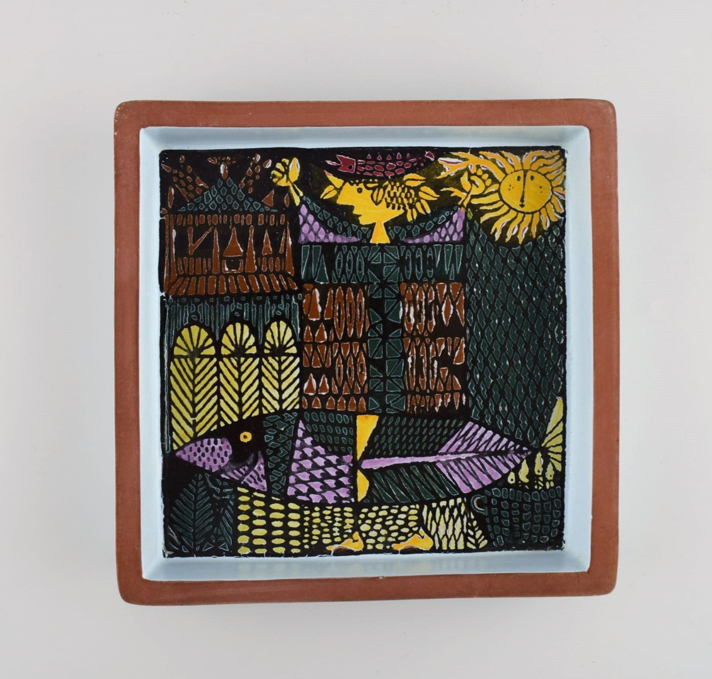 Stig Lindberg (1916-1982) for Gustavsberg. Karneval fad / skål i håndmalet stentøj. Svensk design, midt 1900-tallet. Måler: 20 x 20 x 3,5 cm. I flot stand. Signeret.