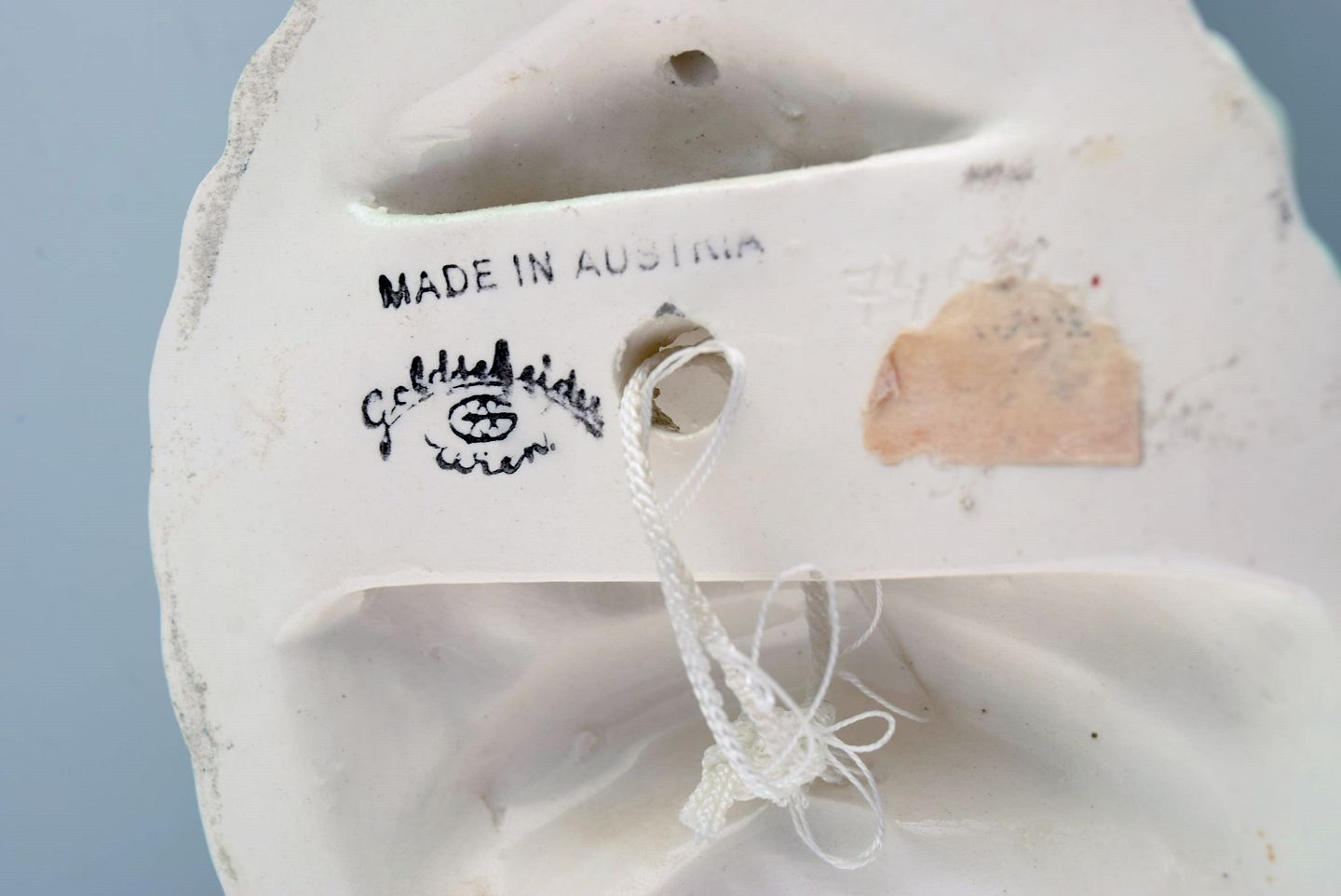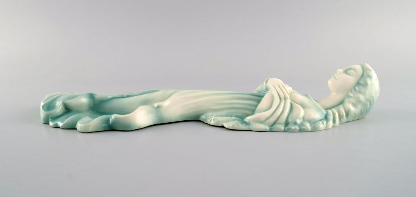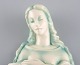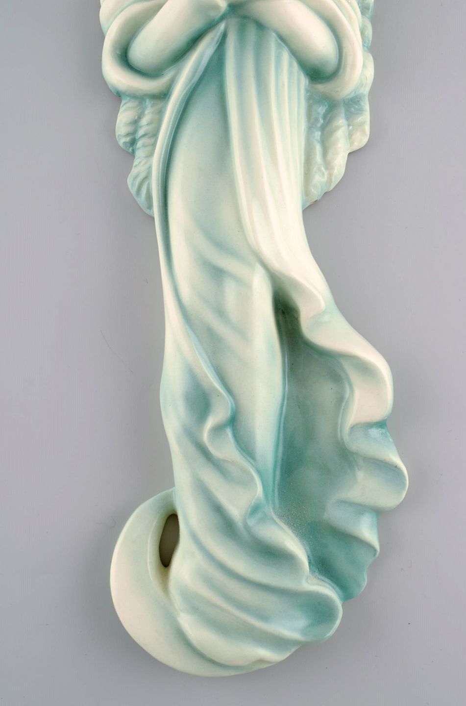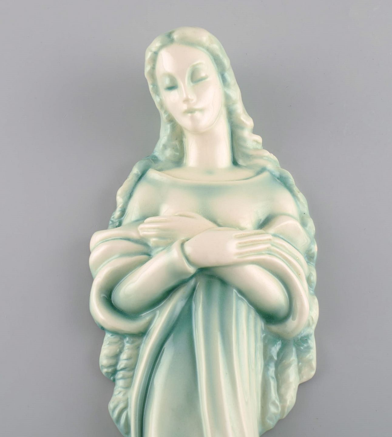 Goldscheider, Østrig. Art deco vægfigur i glaseret keramik. Madonna. Smuk glasur i turkis nuancer. 1940'erne. Måler: 36 x 11 cm. Dybde: 5,5 cm. I flot stand. Signeret.