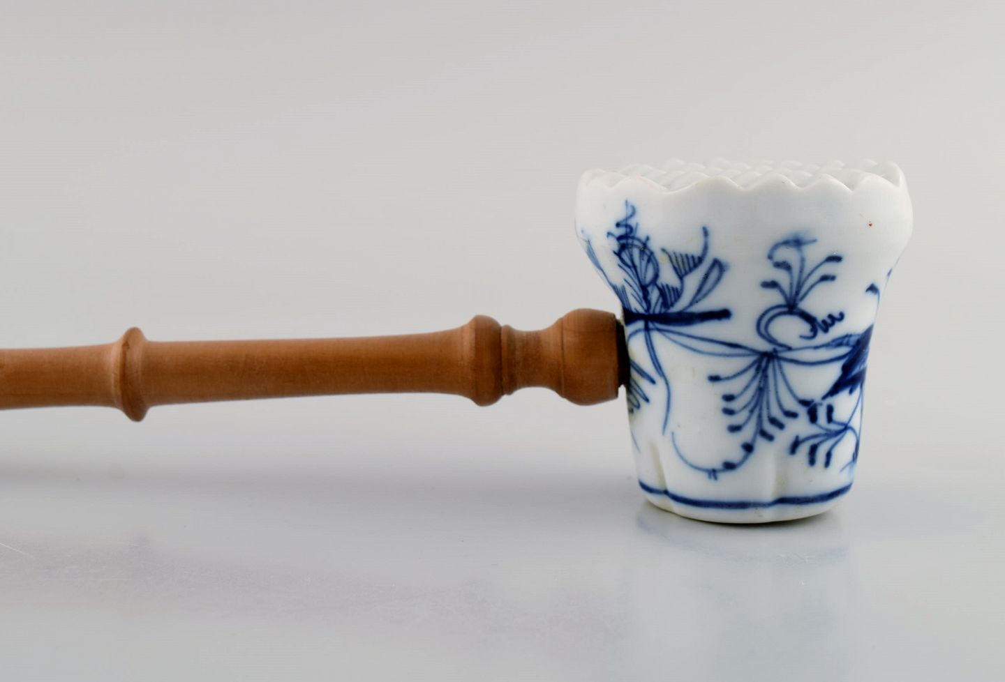 Antageligt Meissen Løgmønstret kødhammer i håndmalet porcelæn med hank i drejet træ. Ca. 1900. Længde: 30,5 cm. I flot stand.