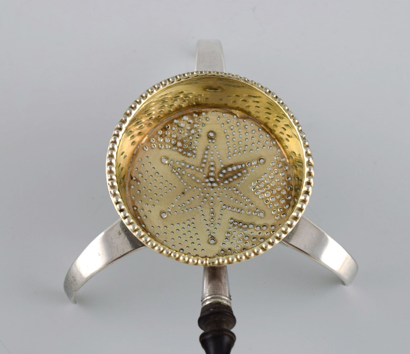 Europæisk sølvsmed. Antik sølv tesi på trefod med skaft i drejet ibenholt. Forgyldt indvendigt. 1800-tallet.