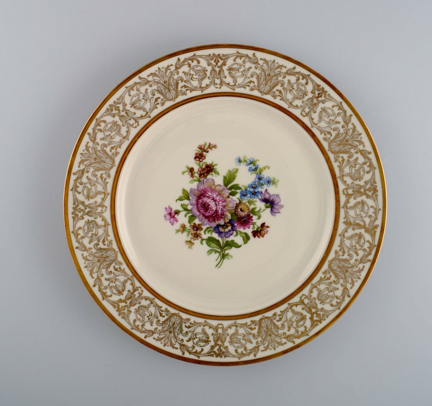 Tolv Tirschenreuth middagstallerkener i porcelæn dekoreret med blomster og gulddekoration. Tyskland, midt 1900-tallet. Diameter: 28 cm. I flot stand. Stemplet.