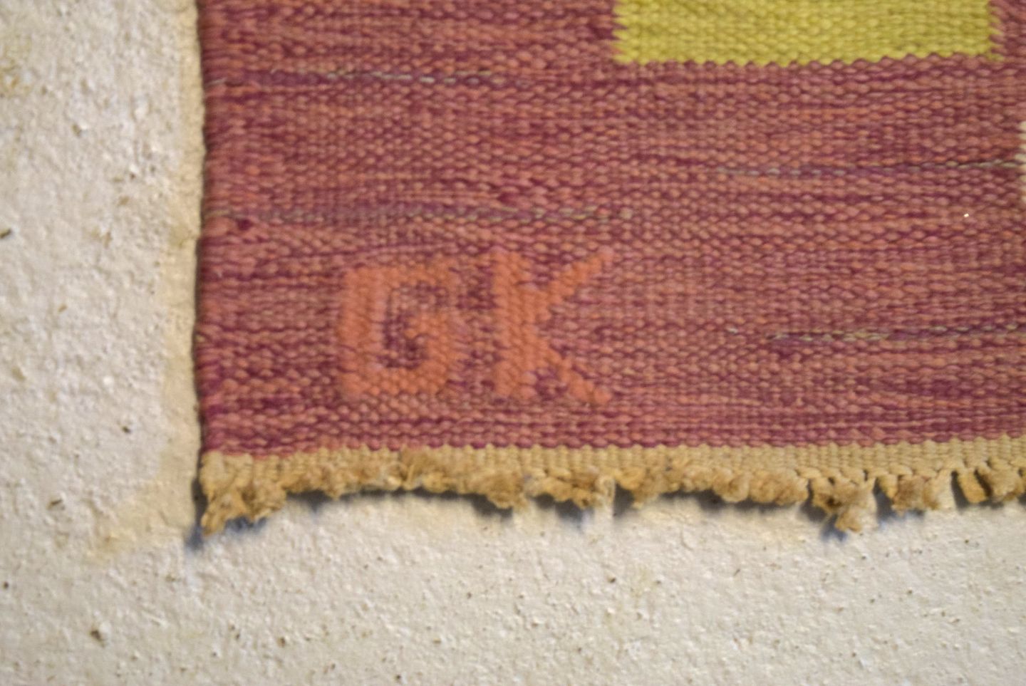 Svensk tekstildesigner. Stort håndvævet RÖLAKAN tæppe i ren uld med geometriske felter og rene linjer. Midt 1900-tallet. Måler: 250 x 165 cm. I flot stand. Signeret i monogram.