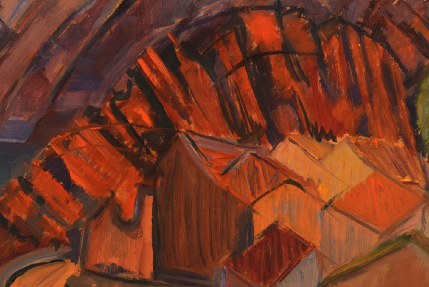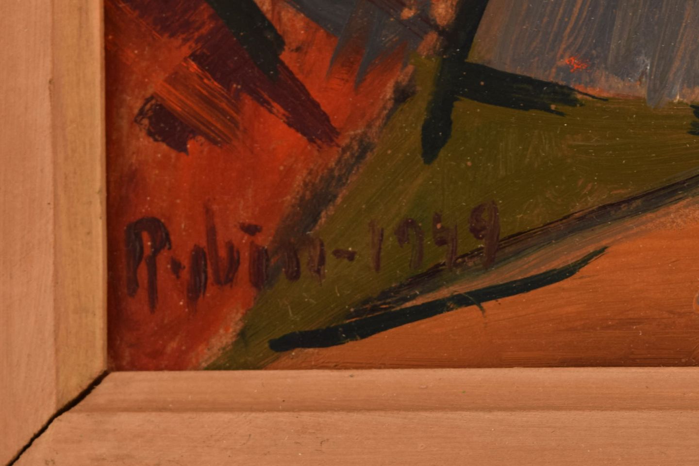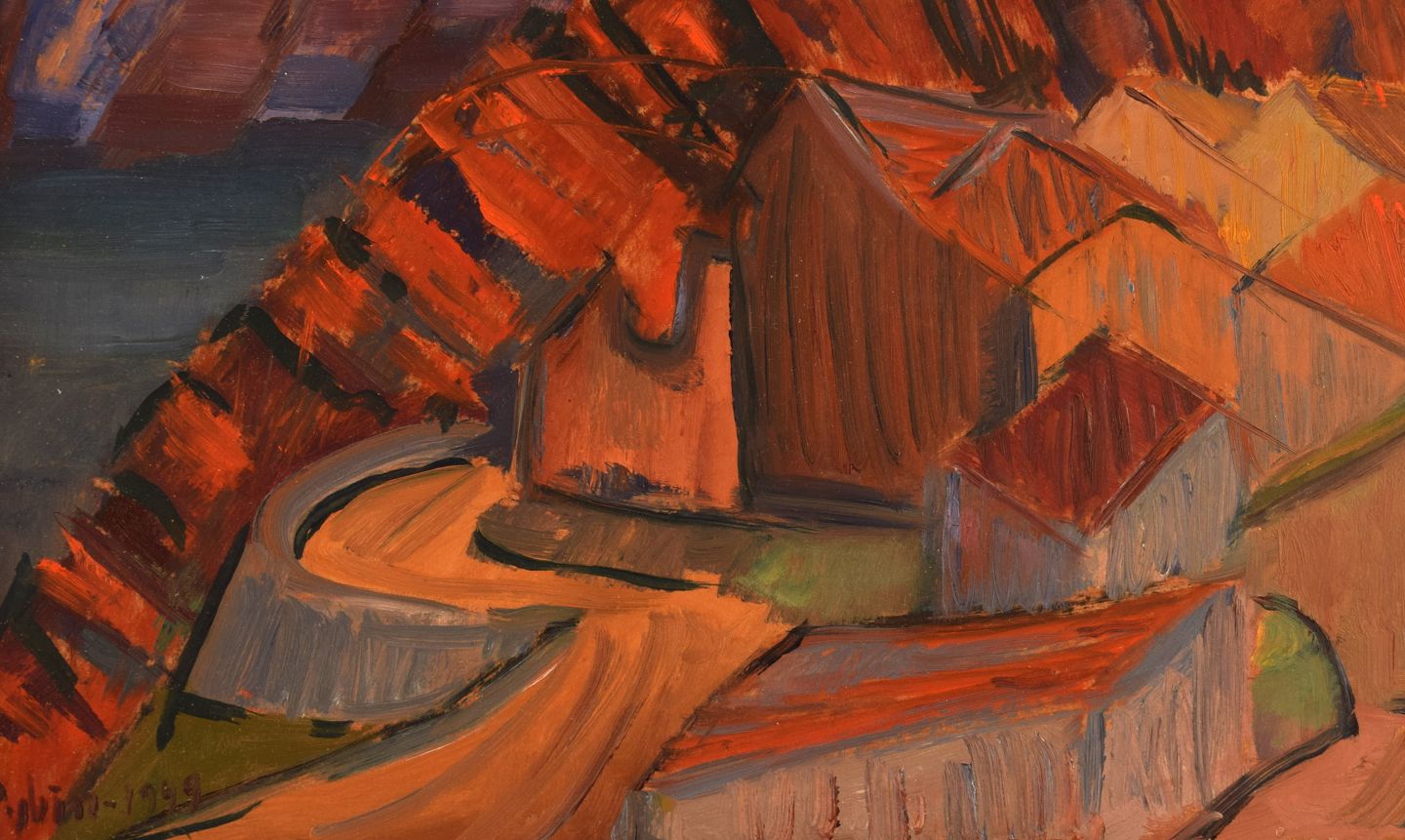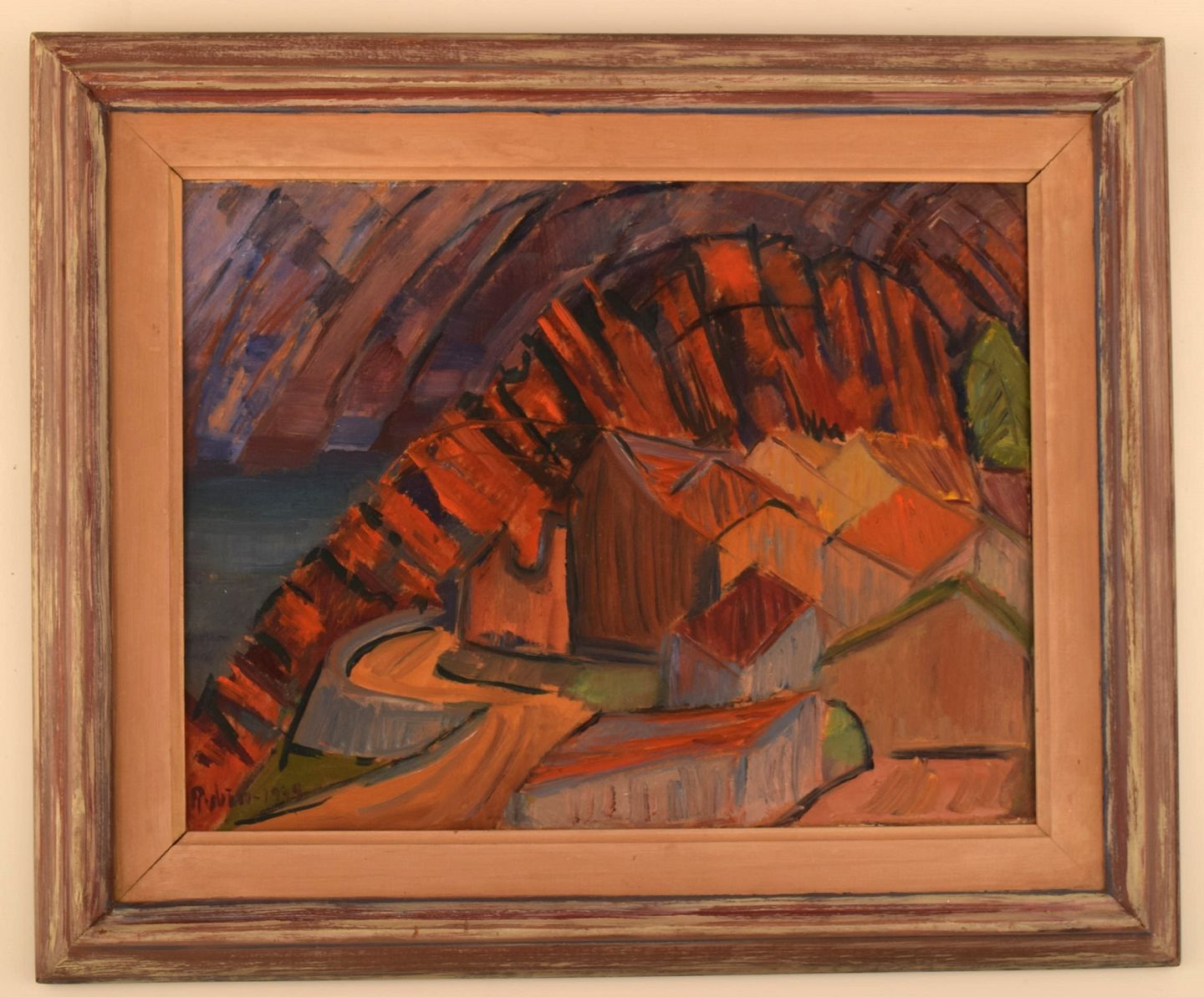 Sven Rybin (1914 - 2012), svensk kunstner. Olie på plade. Modernistisk landskab. Dateret 1949. Pladen måler: 37 x 28 cm. Rammen måler: 6,5 cm. I flot stand. Signeret og dateret.