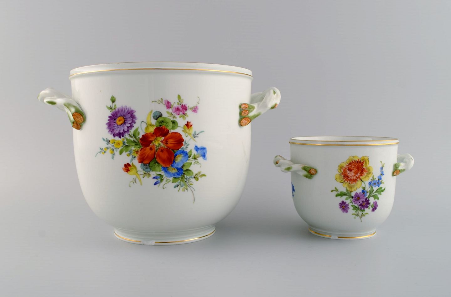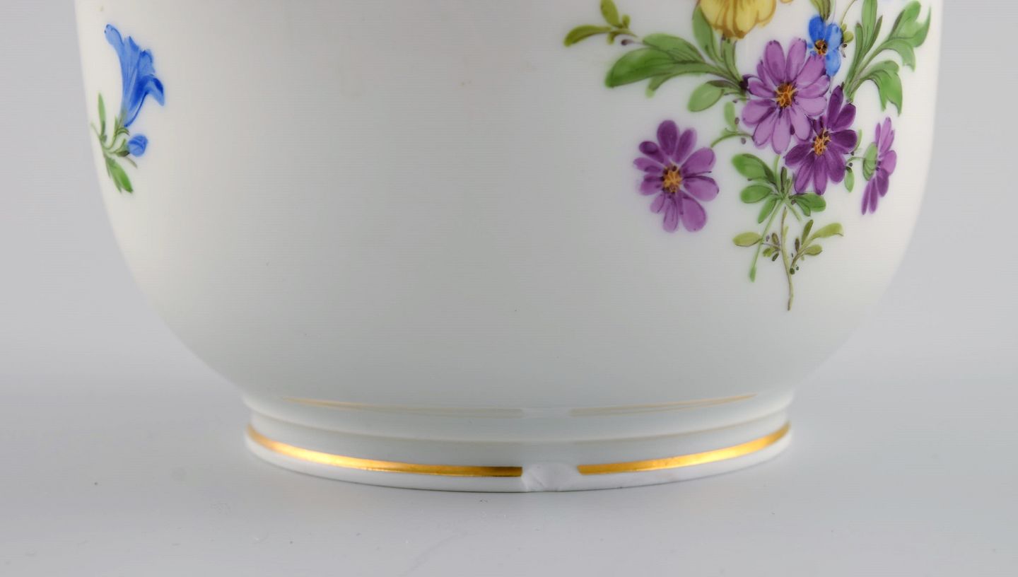 Meissen vinkøler og vase i håndmalet porcelæn med blomster og guldkant. Hanke modeleret som grene. Tidligt 1900-tallet.