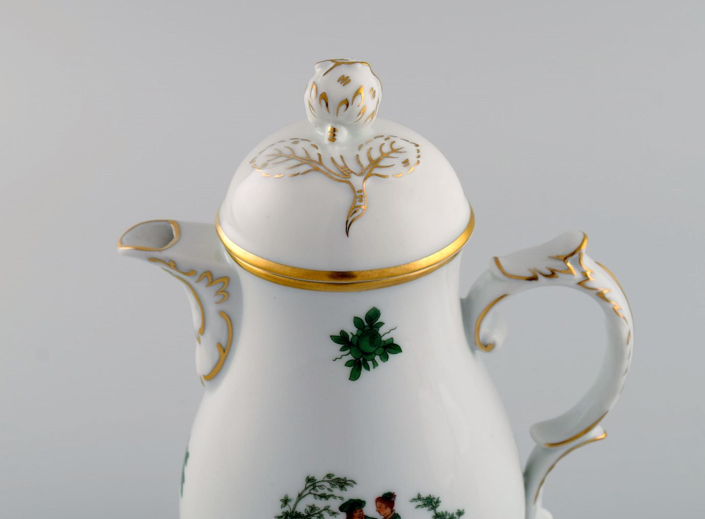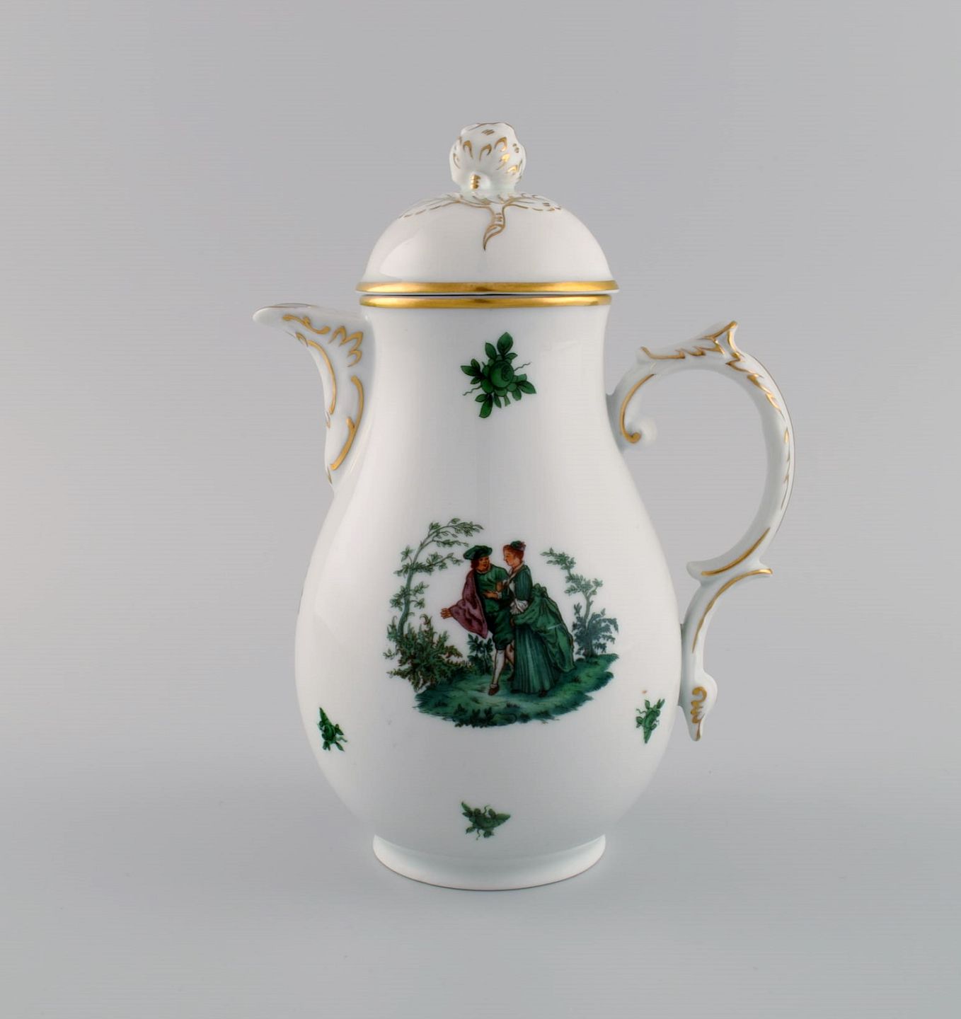 Fürstenberg, Tyskland. Kaffeservice i porcelæn til tolv personer. Romantiske scener og gulddekoration. 1920'erne.