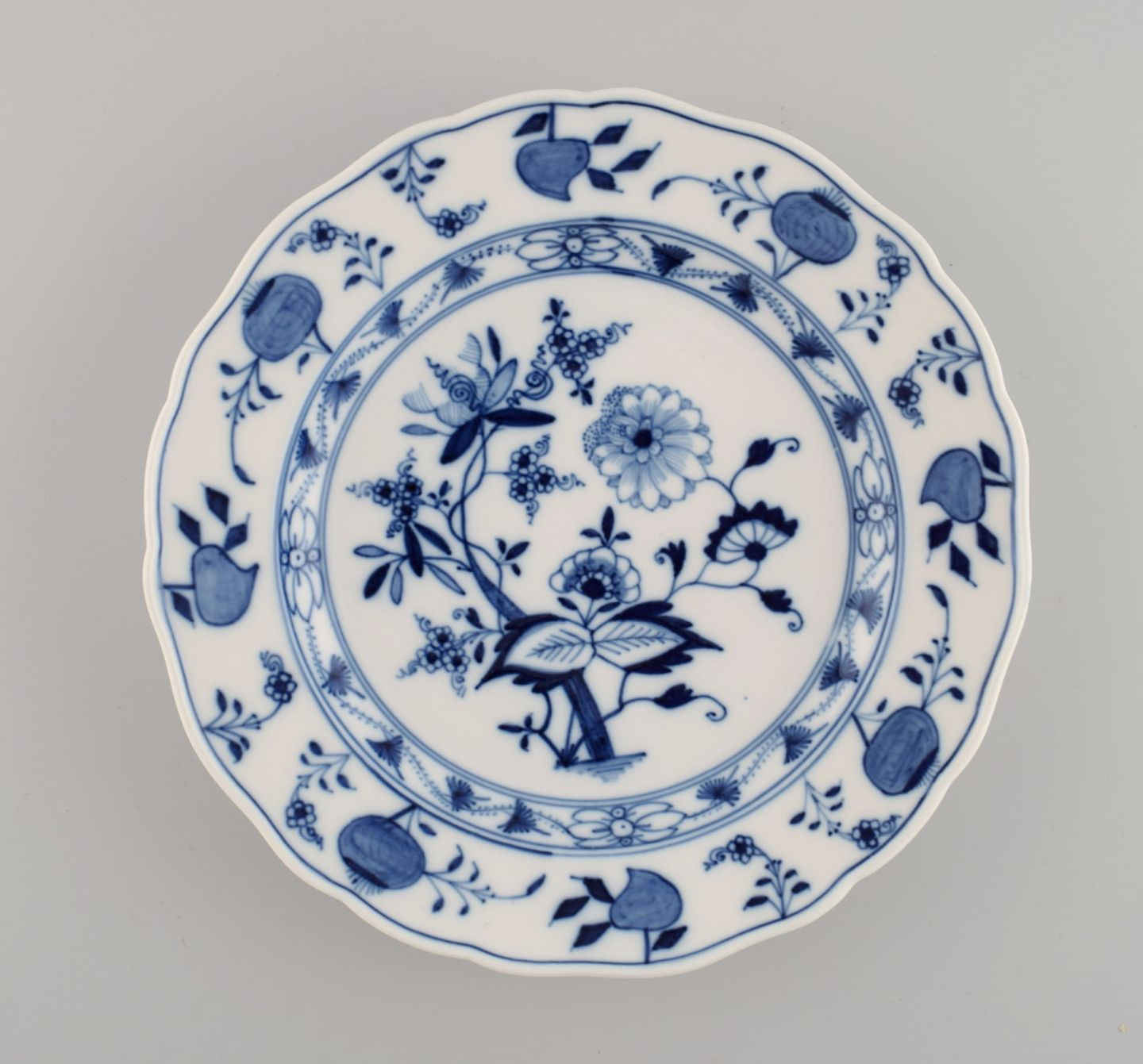 Fire antikke Meissen Løgmønstret middagstallerkener i håndmalet porcelæn. Ca. 1900.
