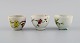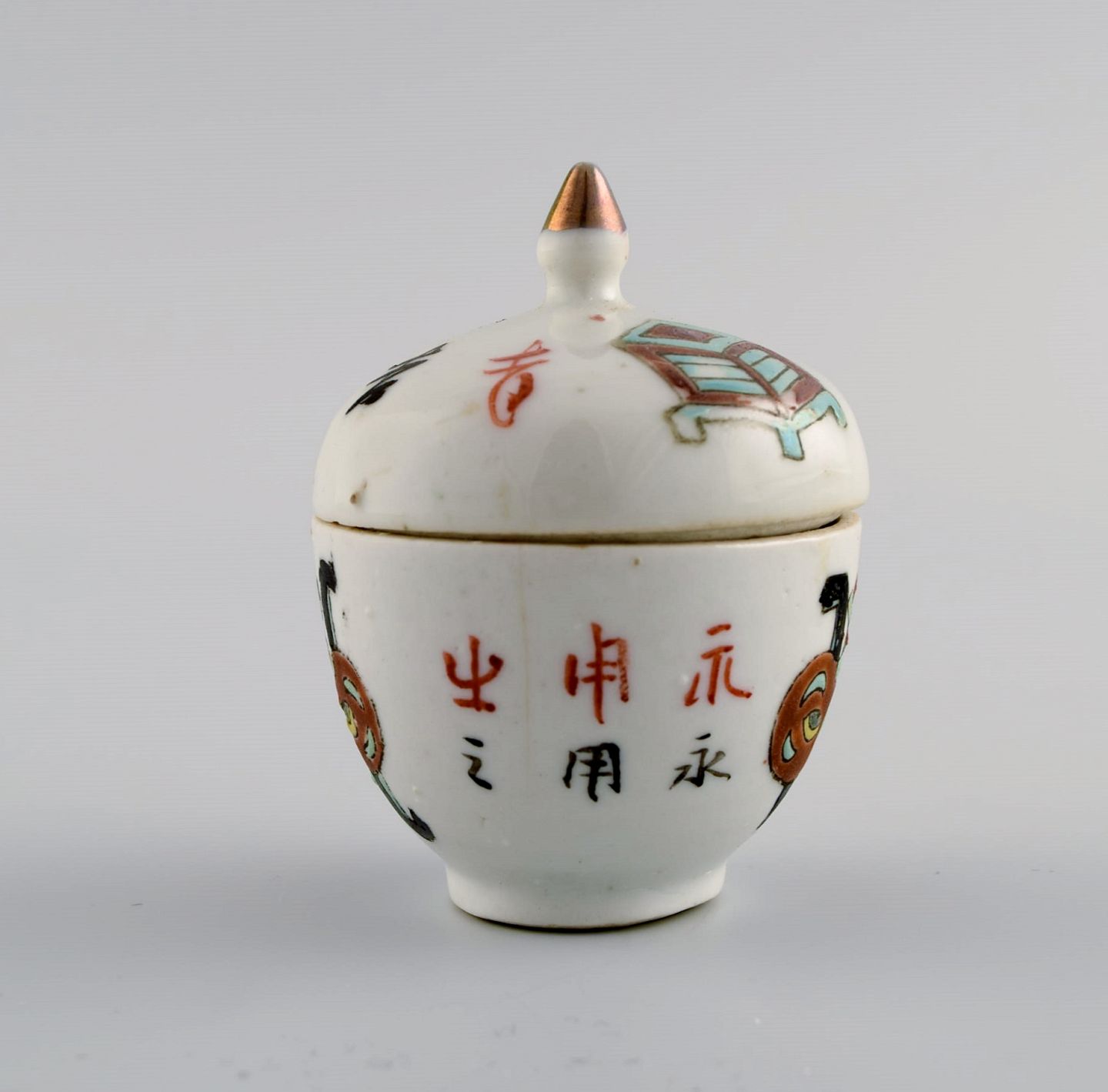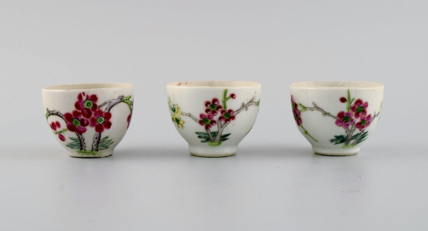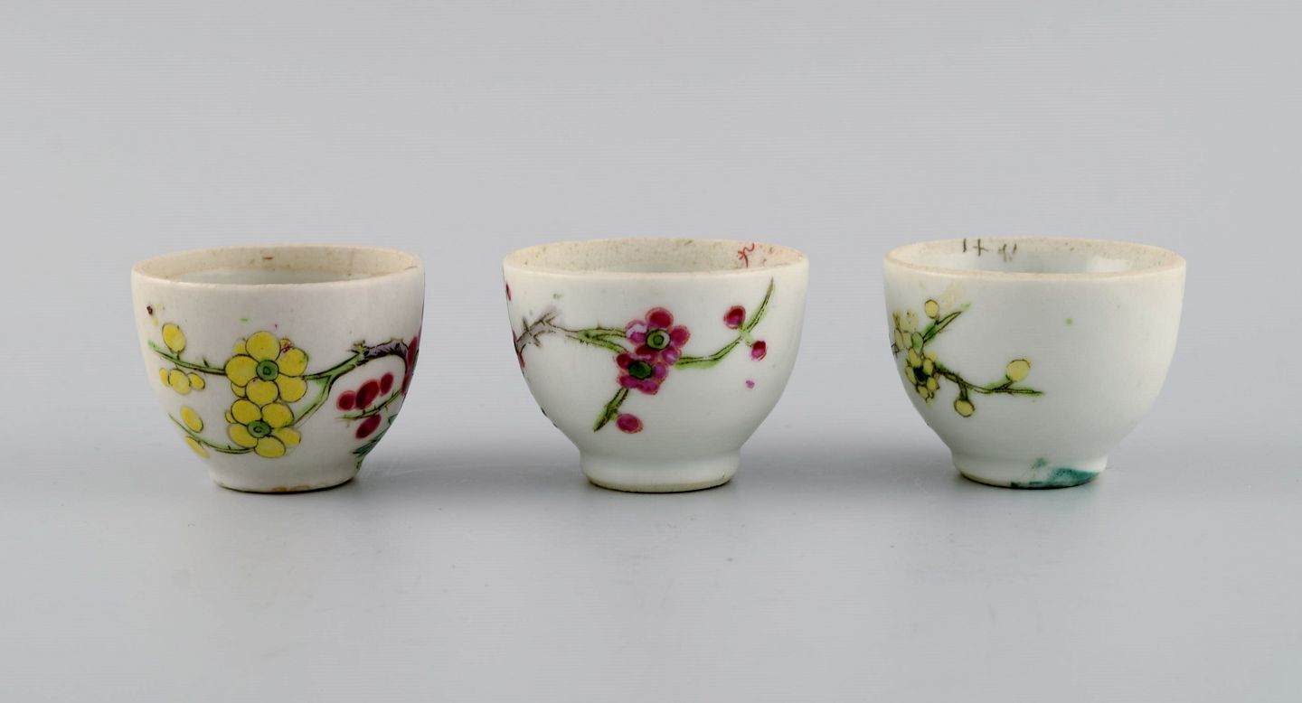 Antik kinesisk lågkrukke og tre kopper i håndmalet porcelæn med blomster. 1800-tallet.