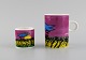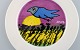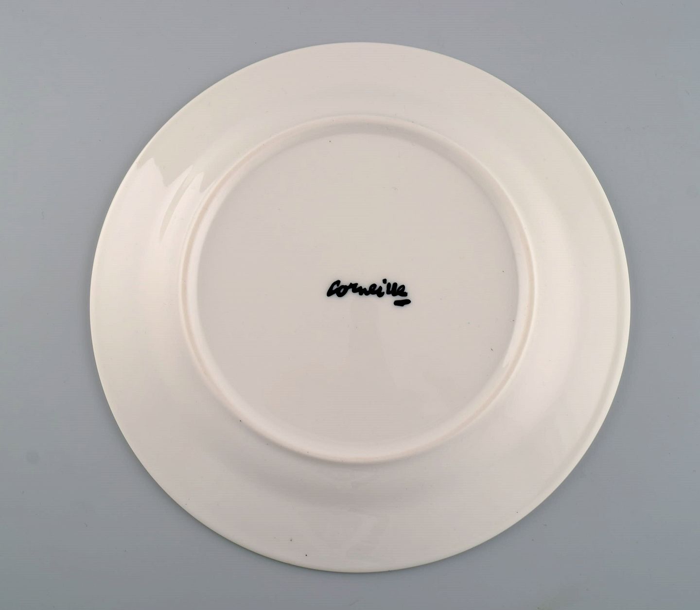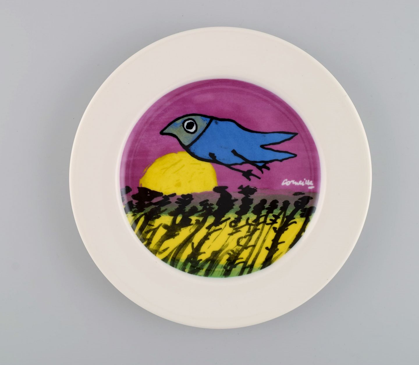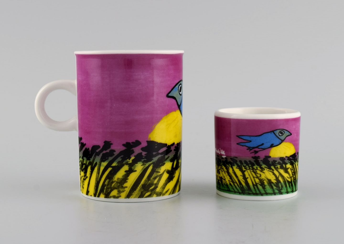 Corneille (Guillaume Cornelis van Beverloo), Hollandsk CoBrA kunstner (1922-2010). Kaffekop, tallerken og æggebæger i porcelæn dekoreret med fugle over mark med solopgang. 1980/90'erne.