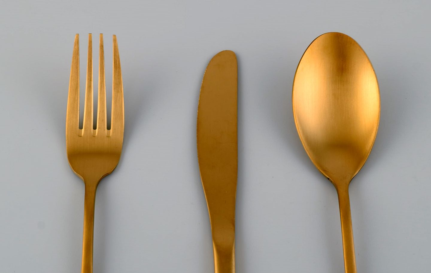 Lagerhaus, Sverige. Middagsservice i børstet messing til tolv personer. Svensk design, 21. Århundrede. Knivlængde: 22.5 cm. I flot stand.