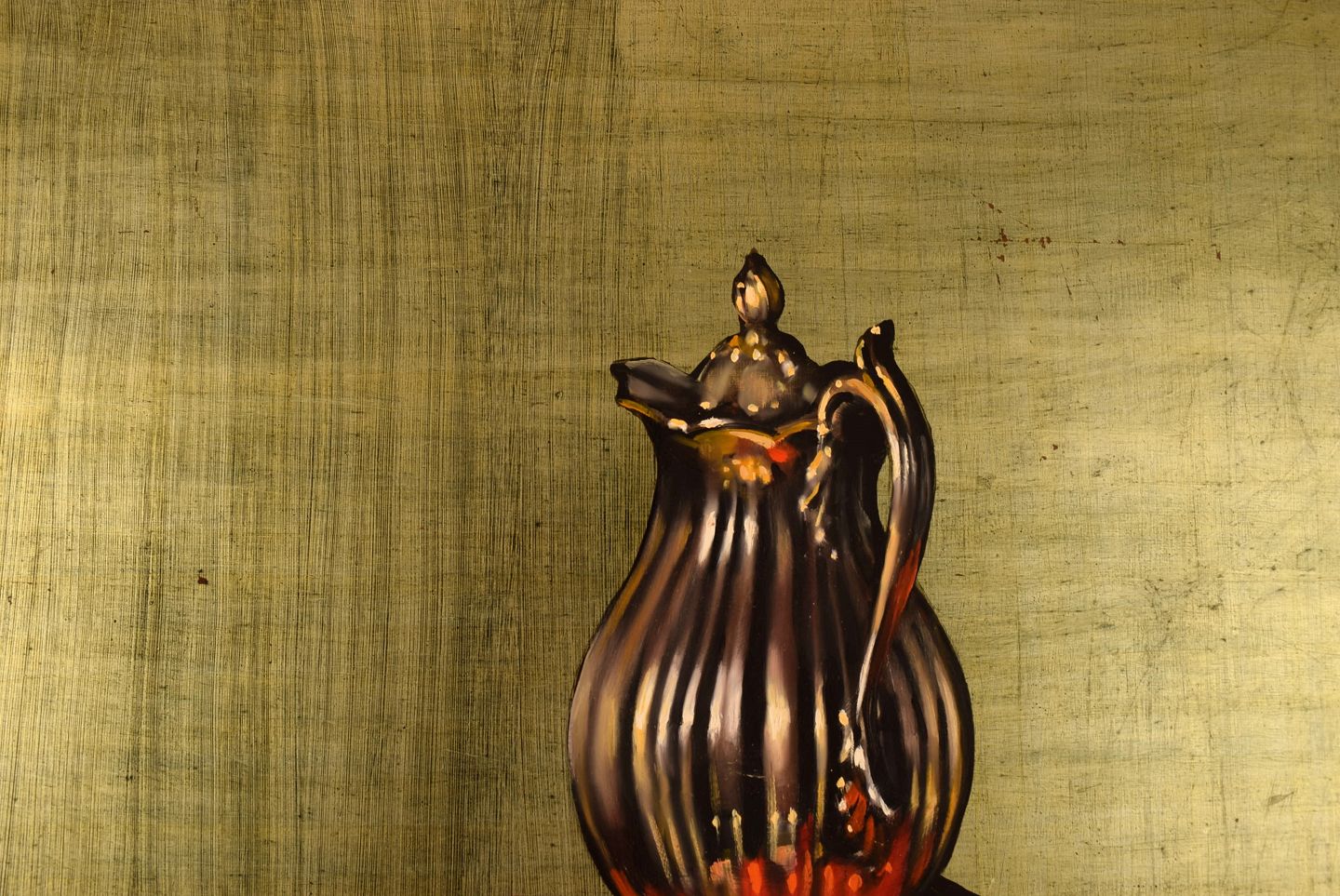 Matt W. Huggins, amerikansk kunstner. Olie på plade. "Silver pitcher on red cloth". 1980'erne.