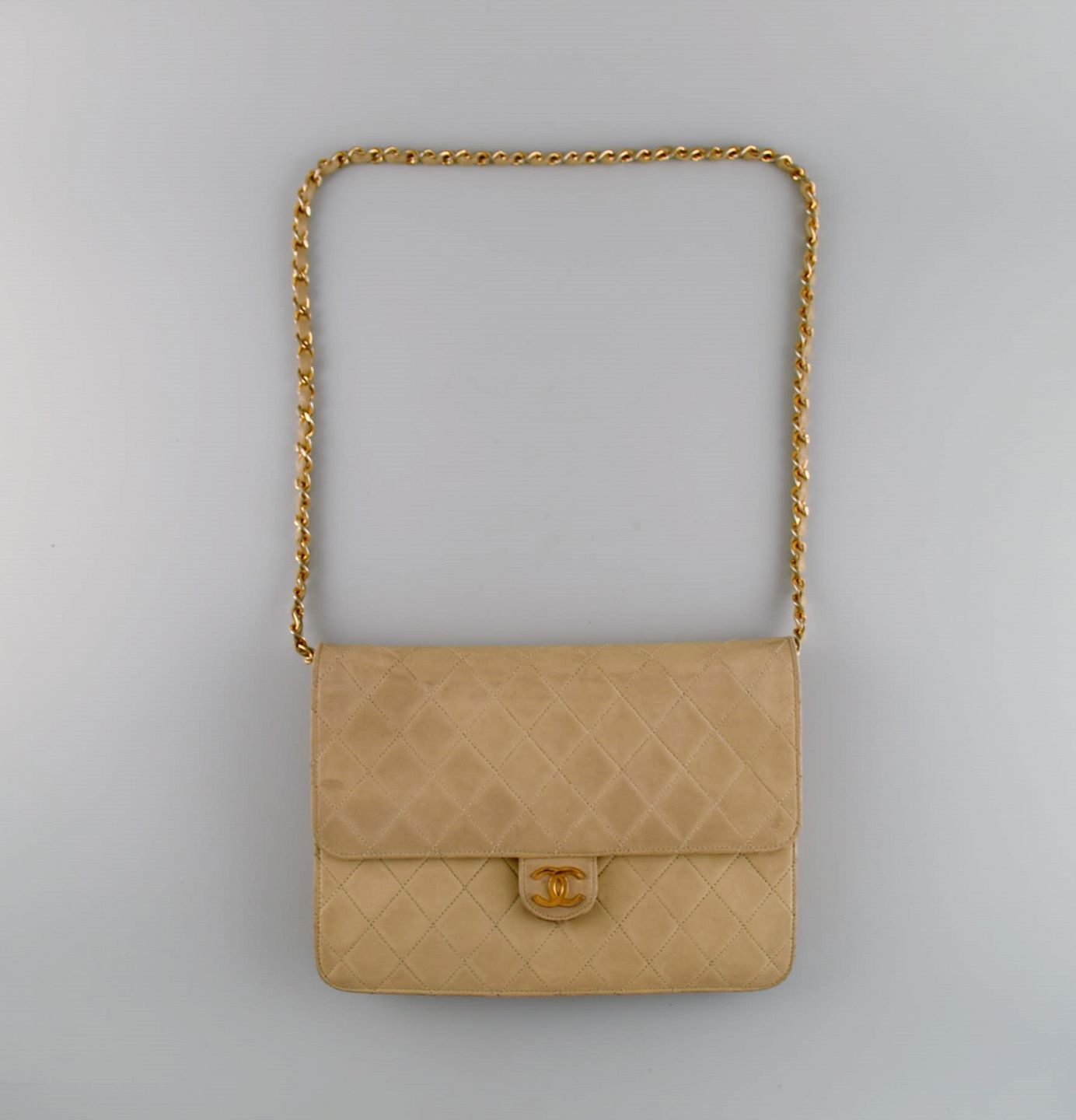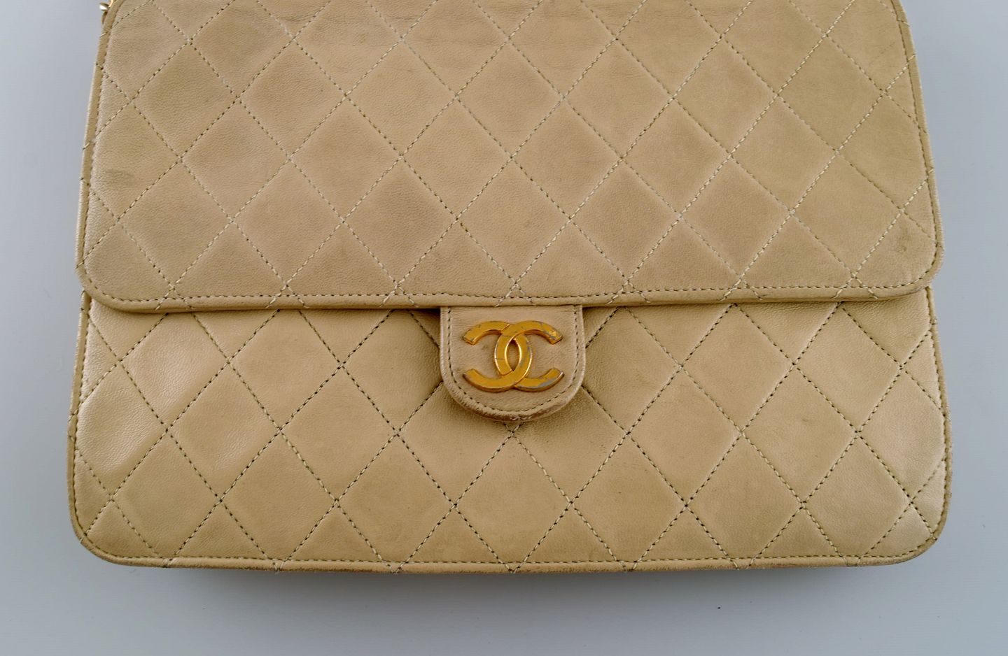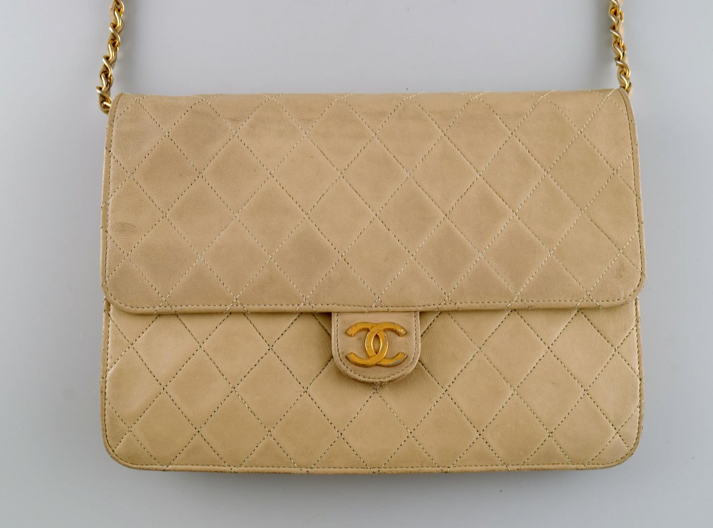 Vintage Chanel skuldertaske i kalveskind. Syninger i ternet mønster. Fransk design, 1970'erne. Måler: 25 x 18 cm. I flot stand. Mindre brugspræg. Stemplet.