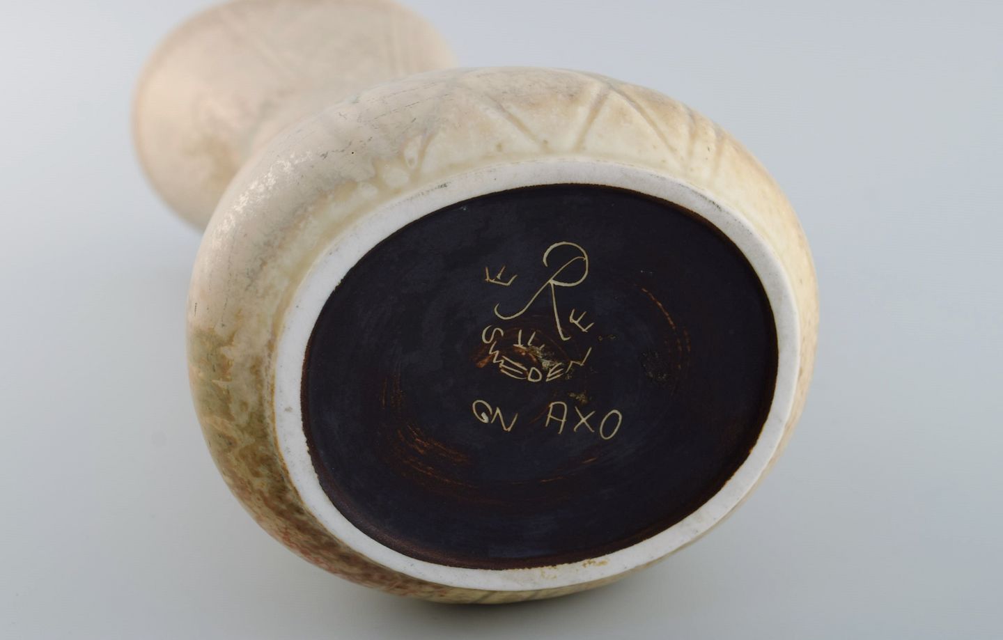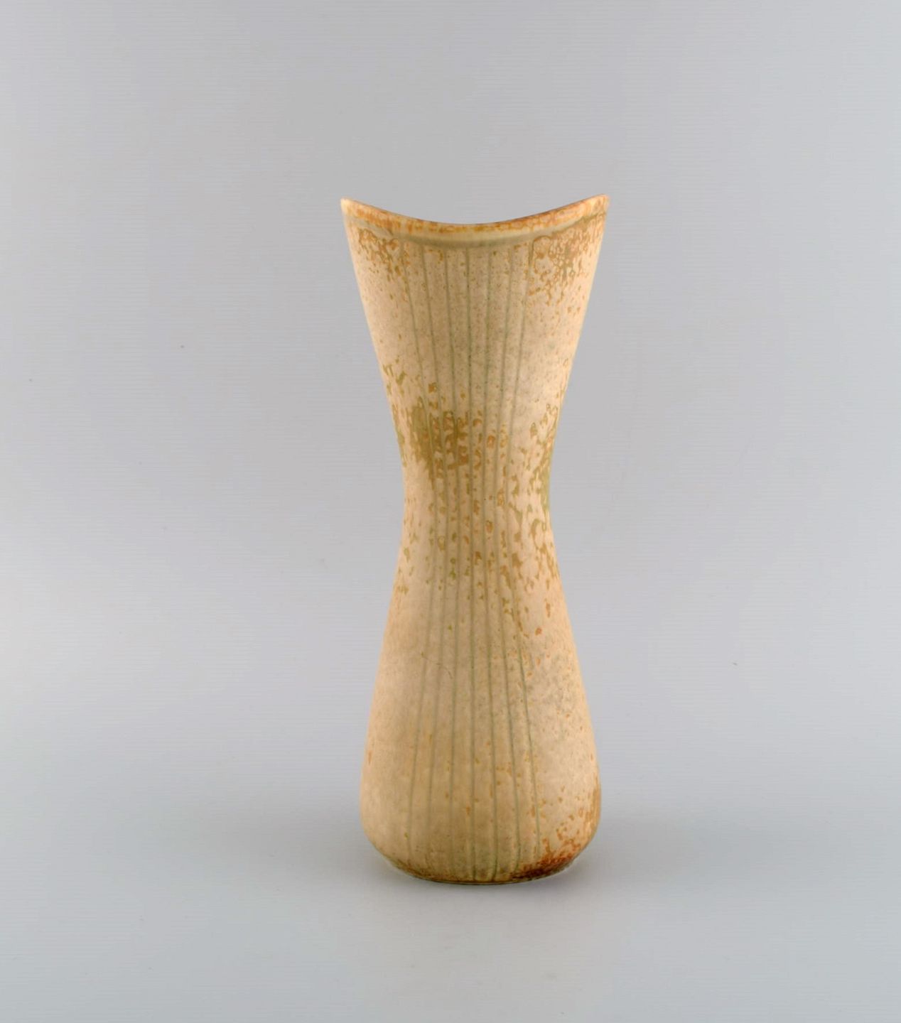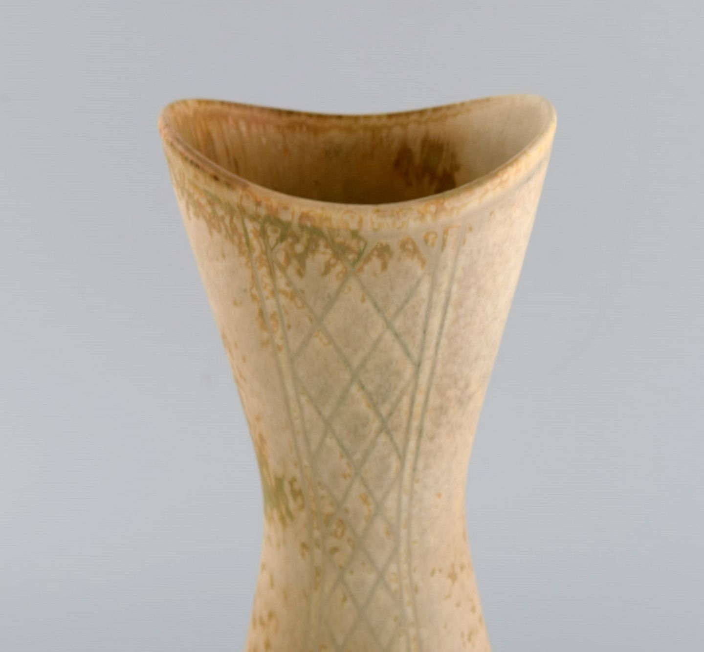 Gunnar Nylund (1904-1997) for Rörstrand. Vase i glaseret keramik med indridset ternet mønster. Smuk æggeskalsglasur. Midt 1900-tallet. Måler: 27,5 x 11 cm. I flot stand. Signeret. 1. Sortering.