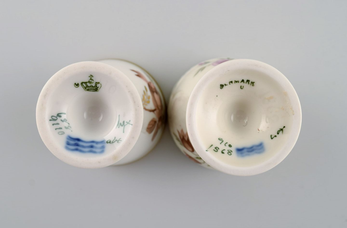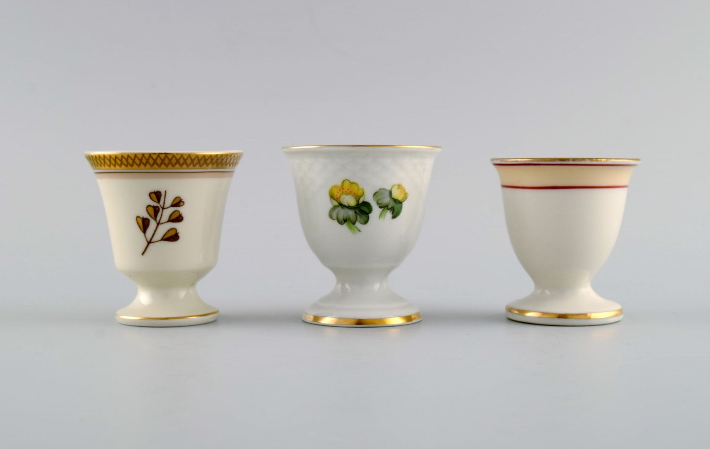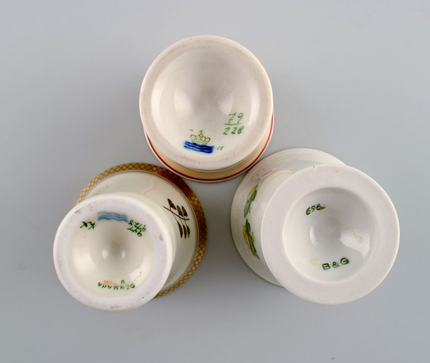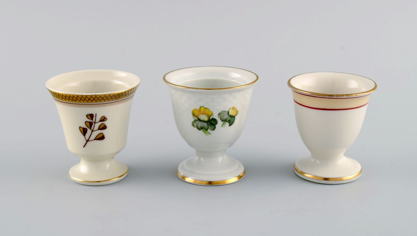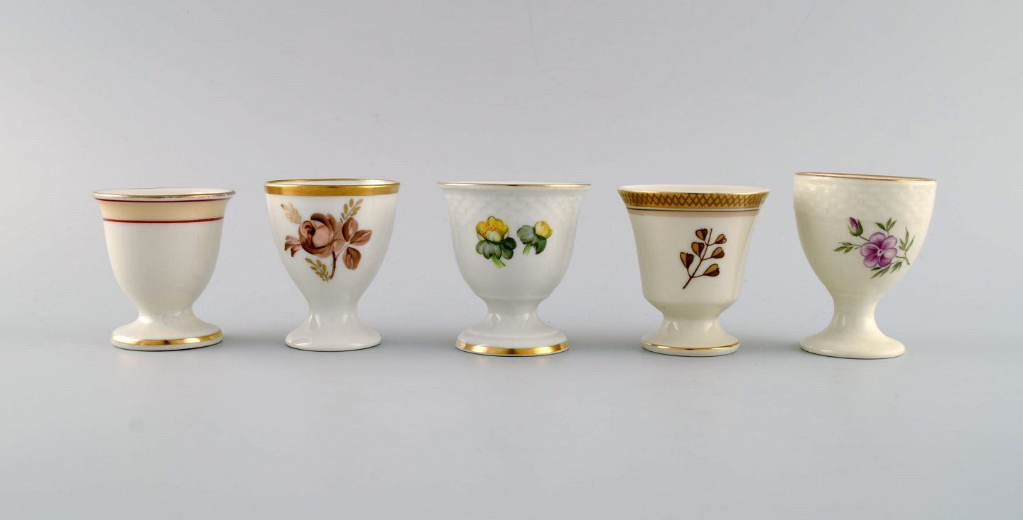 Royal Copenhagen og Bing & Grøndahl. Fem æggebægre i håndmalet porcelæn. 1920/30'erne.