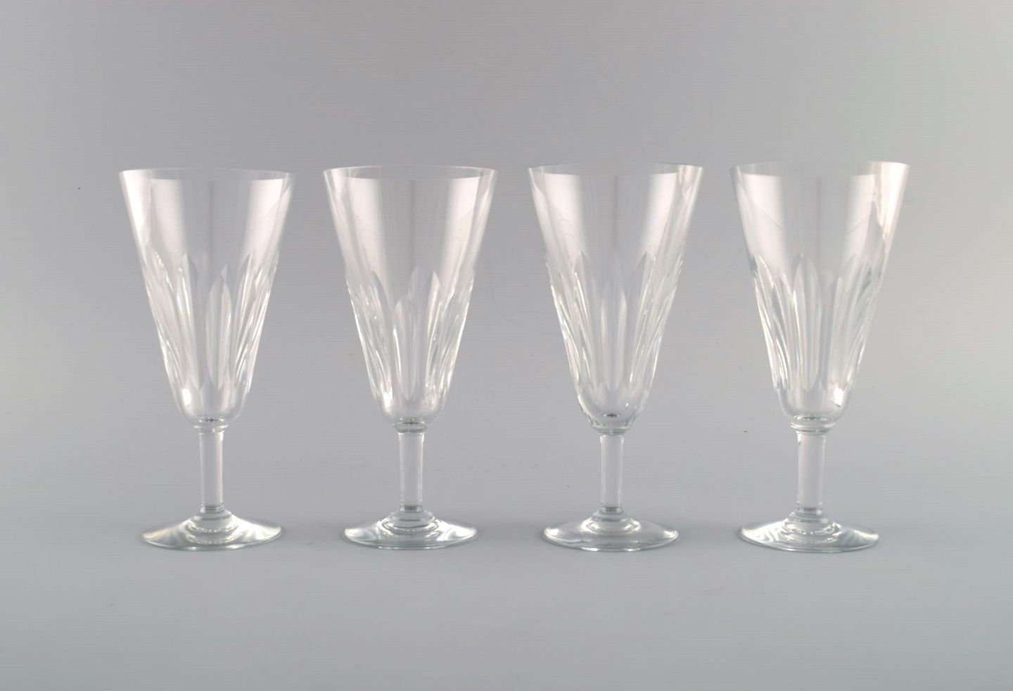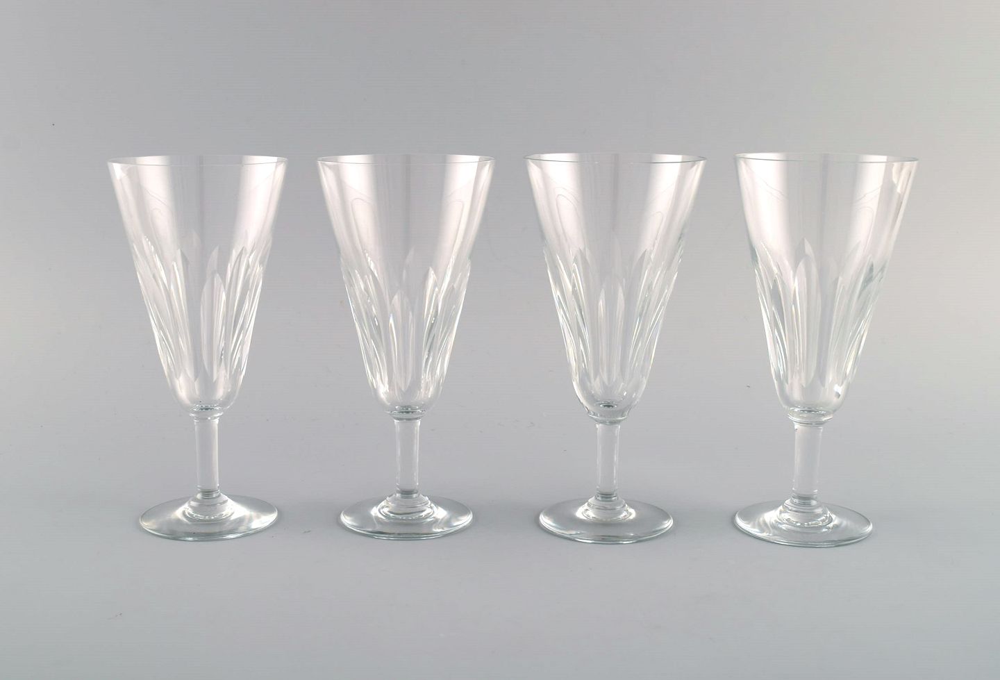 Baccarat, Frankrig. Fire art deco champagnefløjter i klart mundblæst krystalglas. 1930'erne.