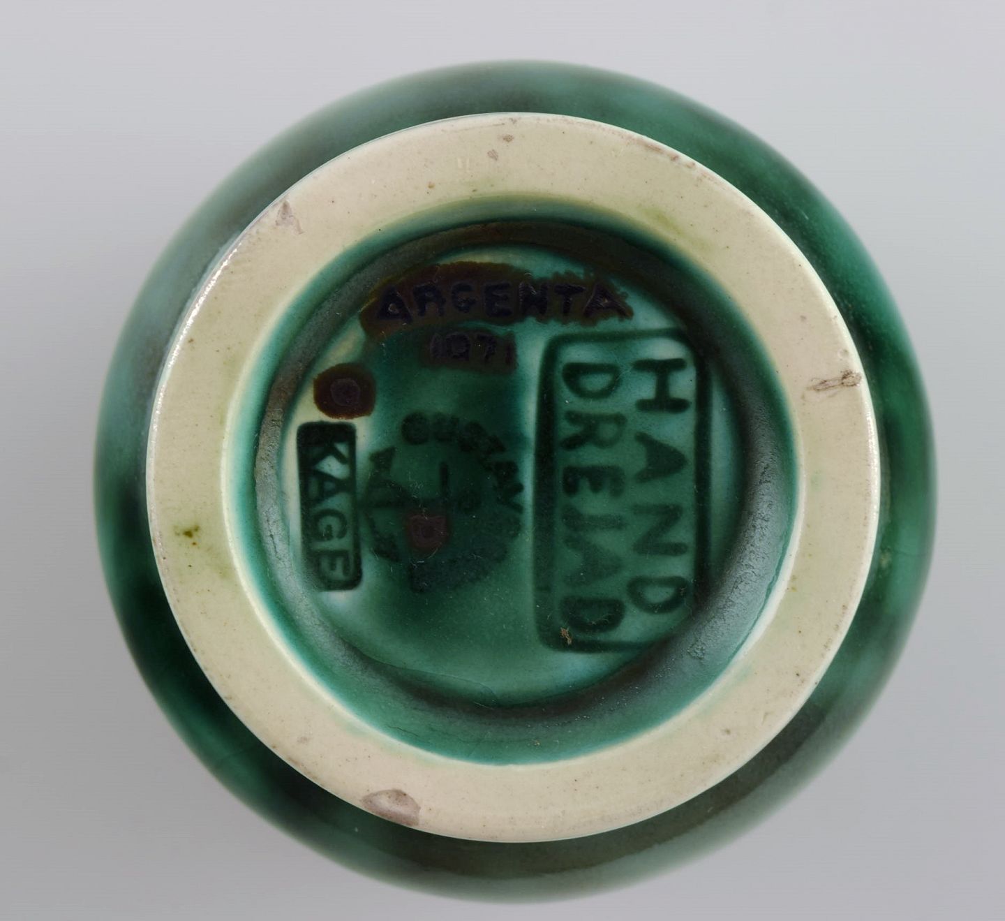 Wilhelm Kåge (1889-1960) for Gustavsberg. Argenta vase og skål i glaseret keramik. Smuk glasur i grønne nuancer med sølvindlæg. Midt 1900-tallet.