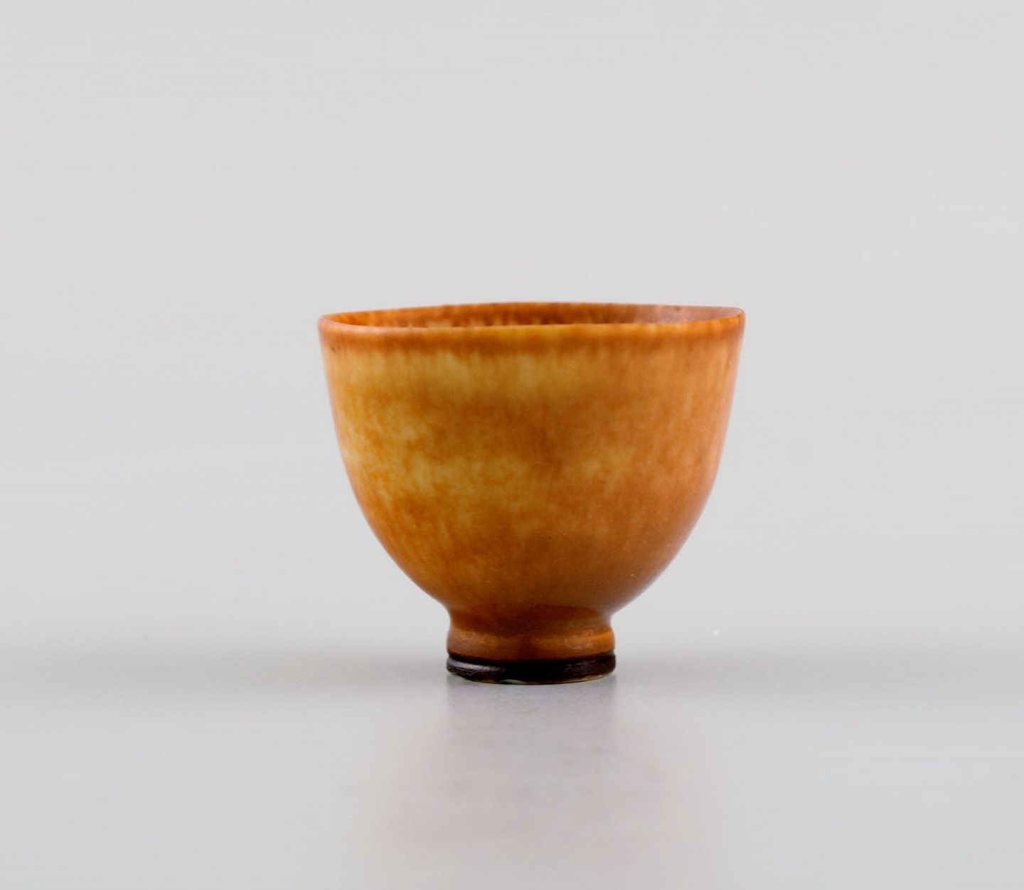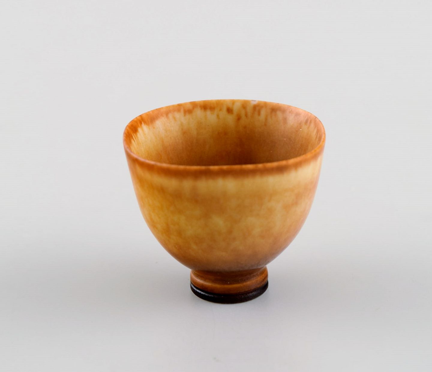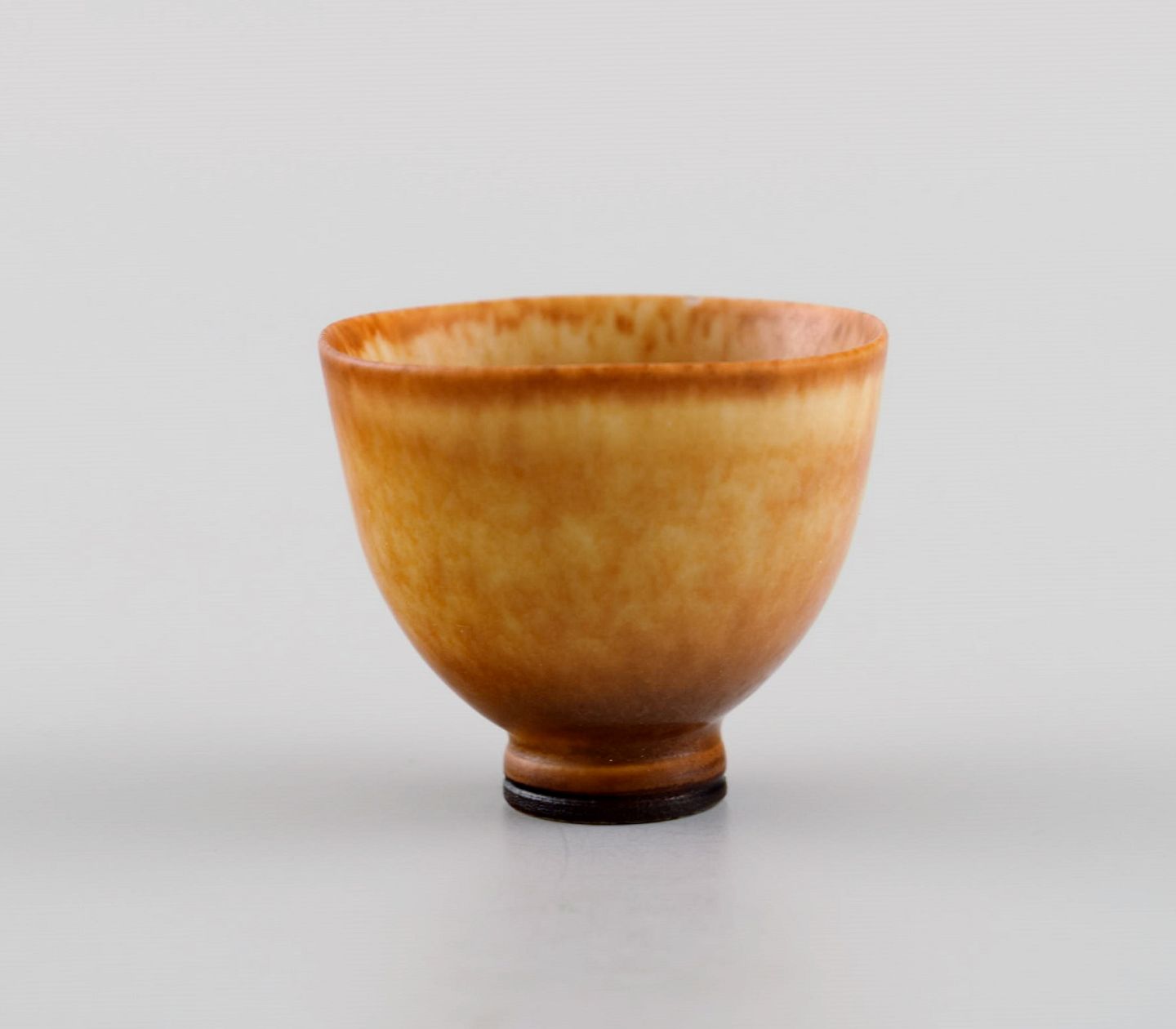 Berndt Friberg (1899-1981) for Gustavsberg Studiohand. Miniature vase / skål i glaseret keramik. Smuk glasur i lyse brune nuancer. 1960/70'erne. Måler: 34 x 30 mm. I flot stand. Signeret.