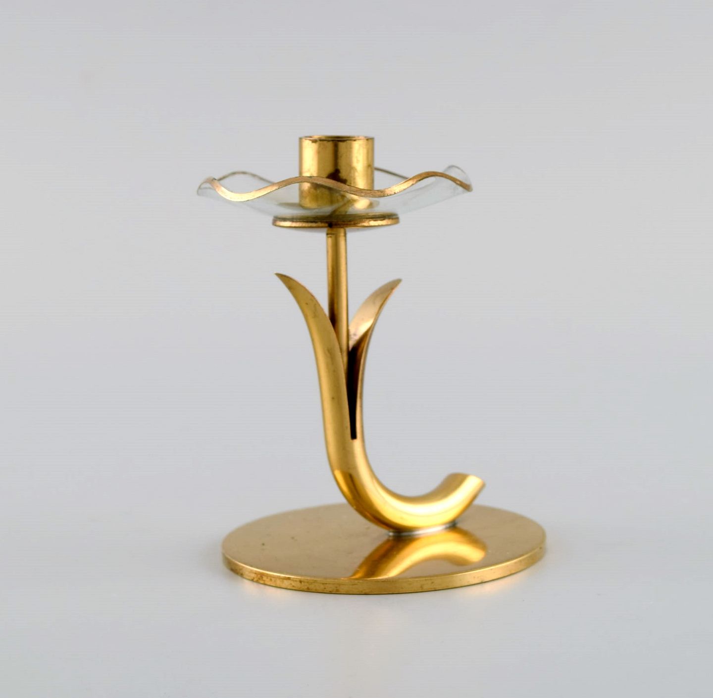 Gunnar Ander for Ystad Metall. Tre lysestager i messing og klart kunstglas formet som blomster. 1950'erne. Måler: 8,5 x 6,5 cm. I flot stand. Stemplet.