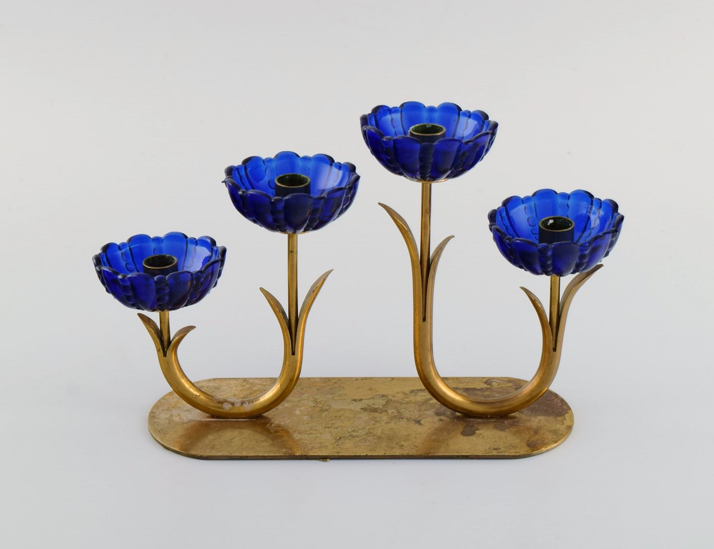 Gunnar Ander for Ystad Metall. Lysestage i messing og blåt kunstglas formet som blomster. 1950'erne. Måler: 21 x 12,5 x 6,5 cm. I flot stand med patina. Kan poleres så den fremstår ny.