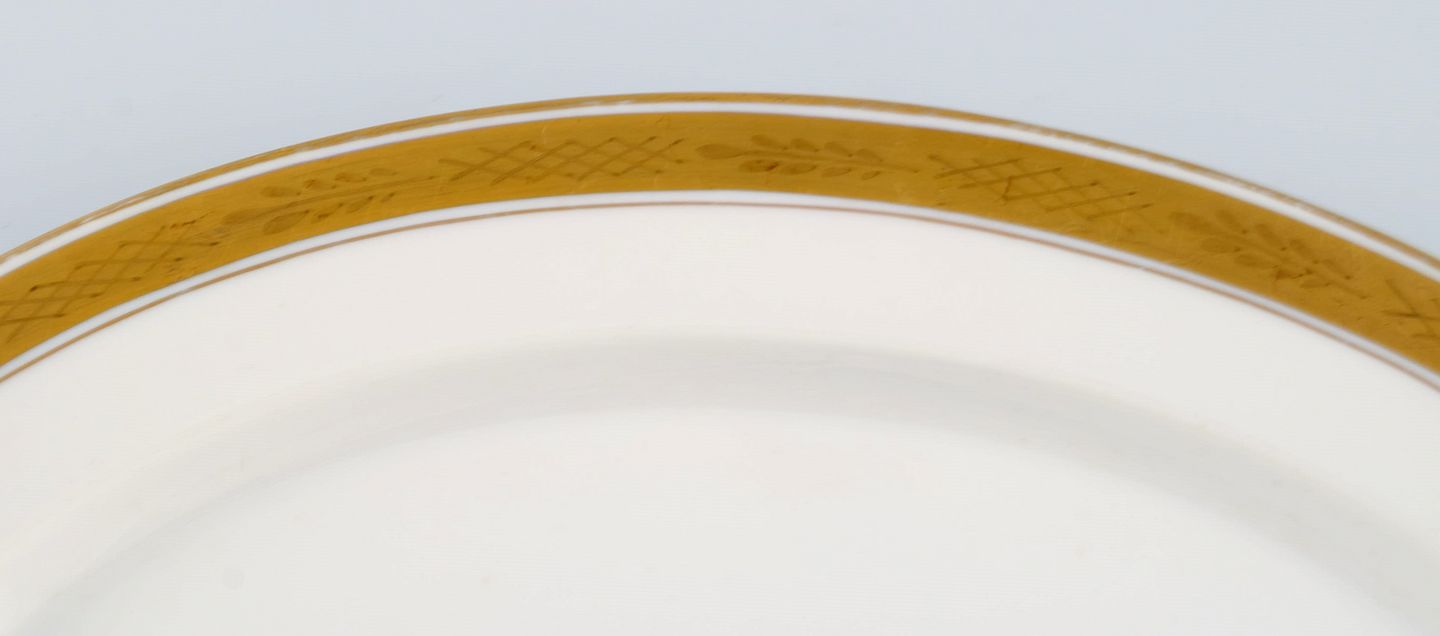 Royal Copenhagen stel nr. 607. To ovale porcelænsfade. Guldkant med bladværk. 1940'erne. Største måler: 28 x 21 cm. I flot stand. Stemplet. 1. Sortering.