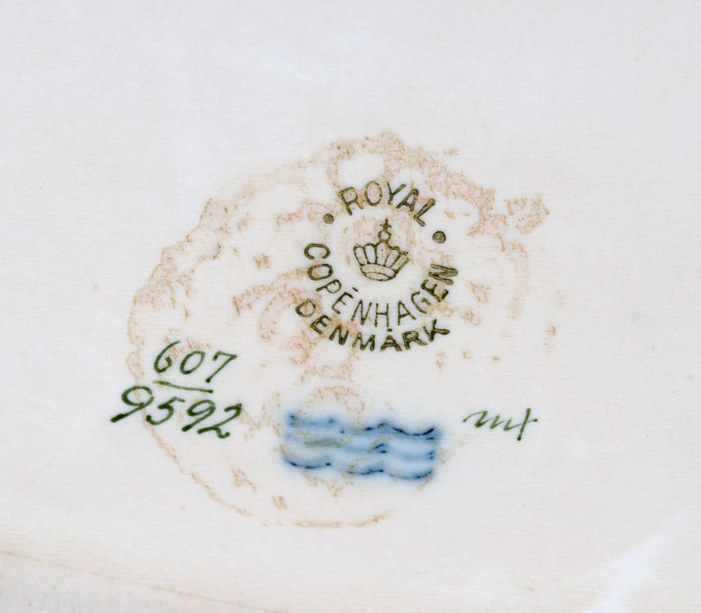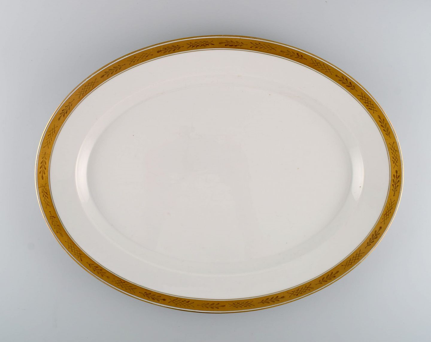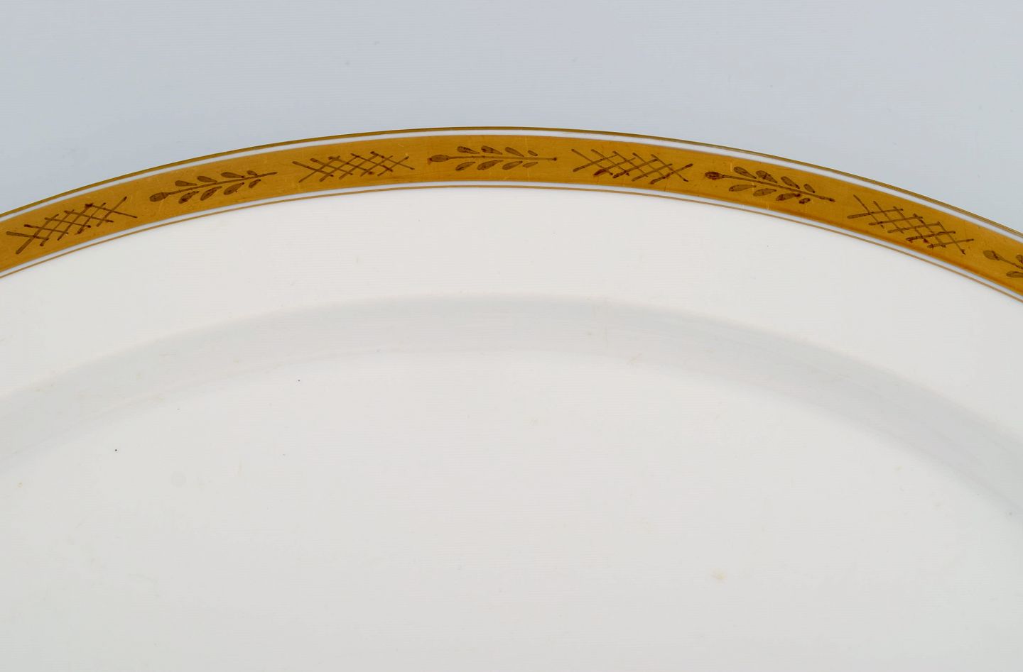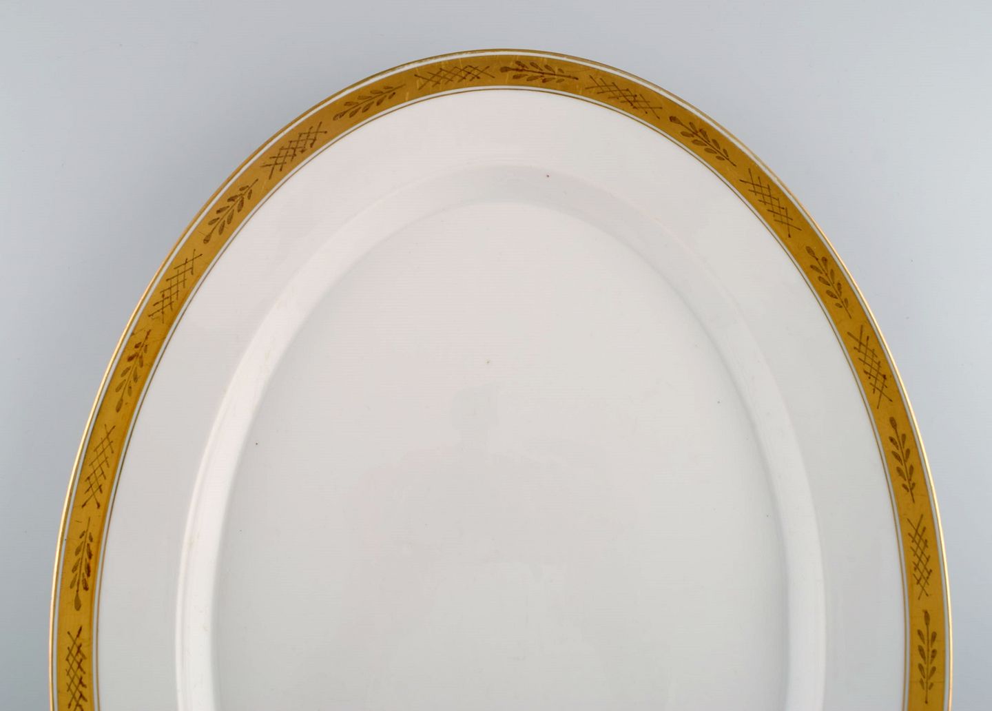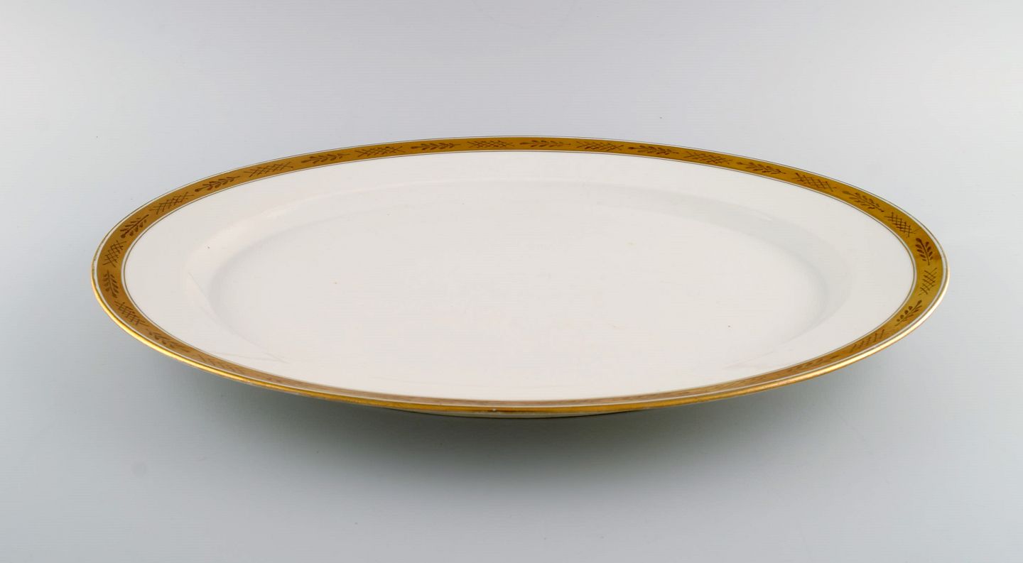 Royal Copenhagen stel nr. 607. Kolossalt serveringsfad i porcelæn. Guldkant med bladværk. Modelnummer 607/9592. Dateret 1943. Måler: 47 x 35 cm. I flot stand. Stemplet. 1. Sortering.